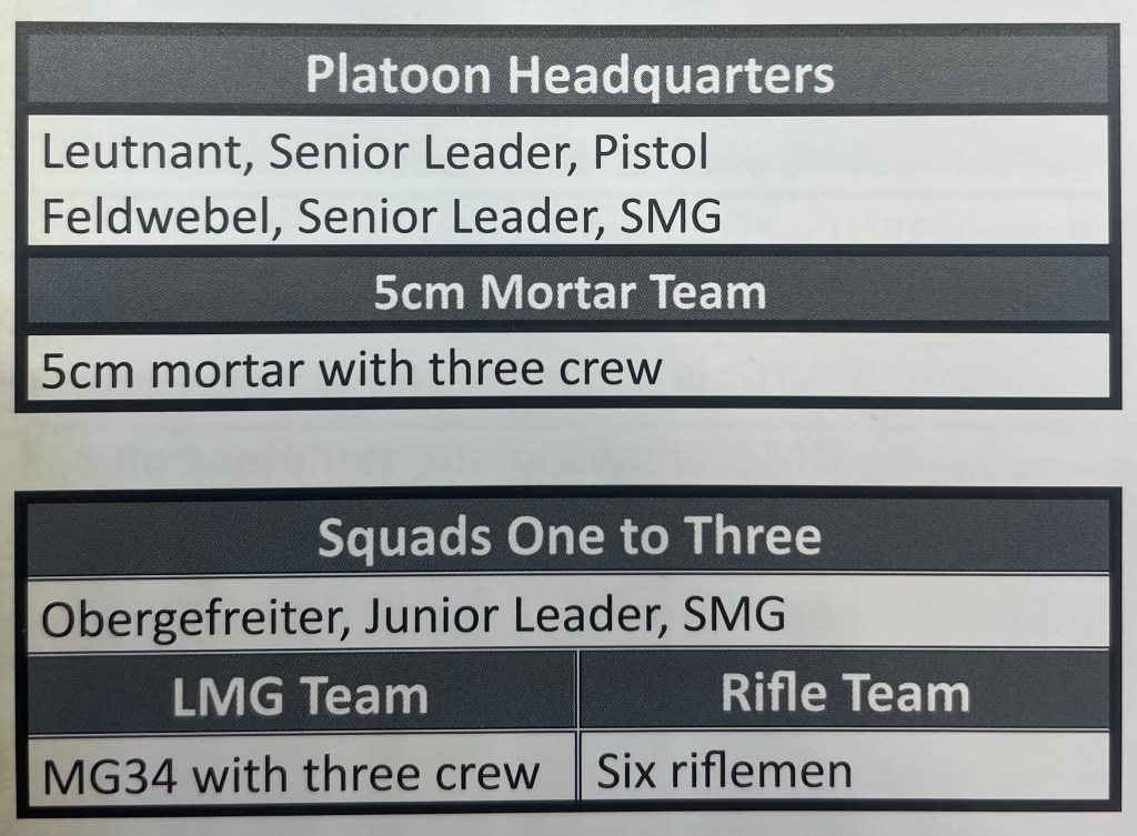 Ben- Evan and I both knew we wanted the Germans to play double duty by being a playable force for Bolt Action and Chain of Command. We knew we also wanted to play a historical and “fluffy”platoon. We were not looking to run a “Smash Teeth” list. Fortunately this is encouraged in the Doubles Event. As I said before I wanted to be able to use the same miniatures for my planned Barbarossa campaign. For my platoon I started with a Second Lieutenant (Leutnant) and body guard (Feldwebel). The Leutnant would be armed with a pistol and the Feldwebel with an MP40, as indicated in the 1940 Schützen Platoon Table of Organization and Equipment (TO&E). After that the TO&E shows 3 identical squads of 10; an Obergefreiter (Sergeant) with MP40, seven riflemen, and a two man MG34 light machine-gun team. In the end one of my three Obergefreiter was issued a rifle instead of his MP40 to shave points to take the platoon support.