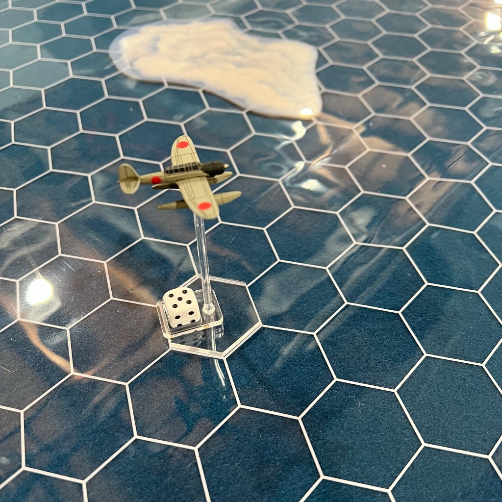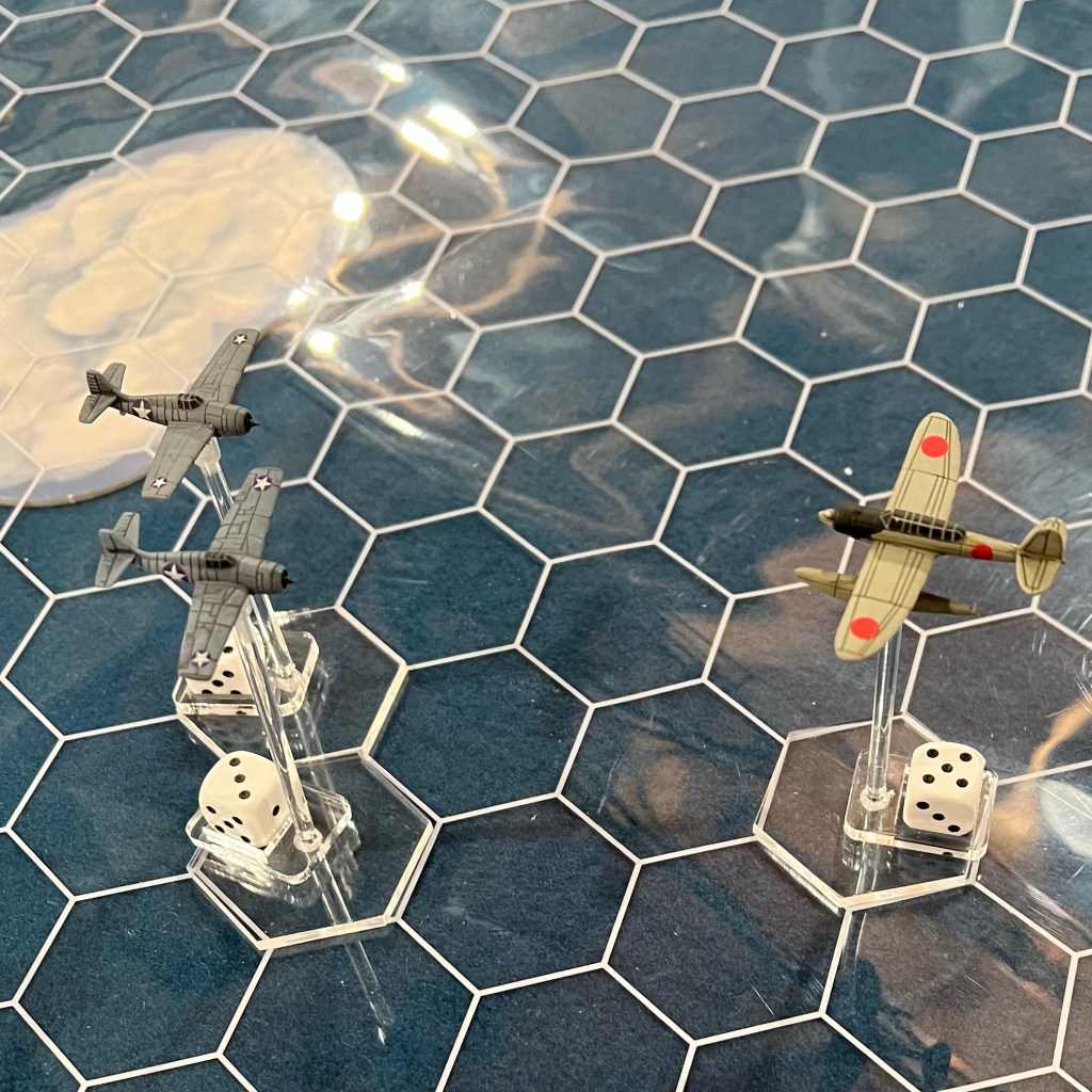 This was a fun little scenario I used to catch up on the rules of Bag the Hun. It didn’t take long and served as a great refresher. Rookie pilots (Sprogs in the rules) are tough to utilize when it comes time to do harder maneuvers. Both sides started as Bogeys as I wanted to explore the spotting rules. Dick and Paul had a simple objective of spotting and eliminating any enemies. The Japanese E13A “Jake” reconnaissance plane had an objective to get within two hexes of the opposing board edge and roll a spotting check on the US fleet from there. If successful they would then attempt to escape via their own board edge.