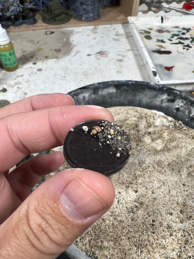 Next I grab a base and put on a smallish blob of CA glue. I spread the glue around with a toothpick or similar until it coats the whole base (If a mini is already on the base I use the toothpick to distribute it around them as I desire). Once this is accomplished I simply take a handful of the basing mix and pour it over the glue gently. If you like a rockier base simply take some of the bigger sand parts floating around in the mix and sprinkle them on before pouring the rest of the mix over it. I let that sit up for a few seconds before I pour off the excess, then I usually blow off the extra baking soda (I treat it like a Nintendo 64 cartridge, if you know you know). That’s it, I’m no chemist but somehow the baking soda reacts with the glue and you quickly have a solid base.
