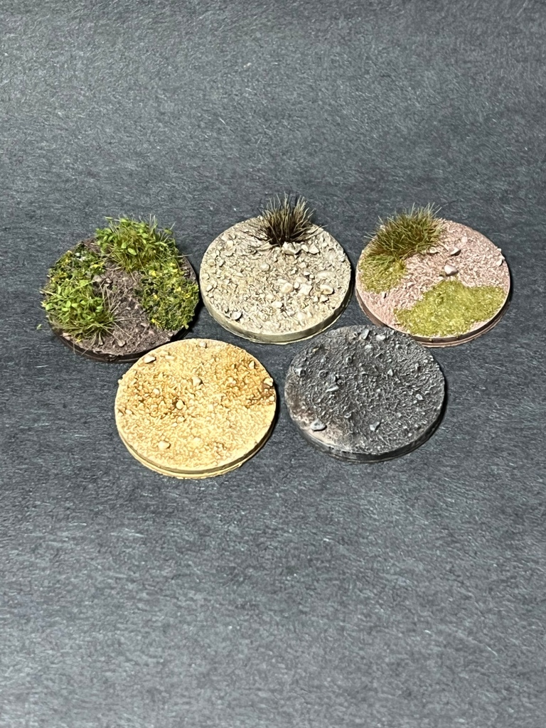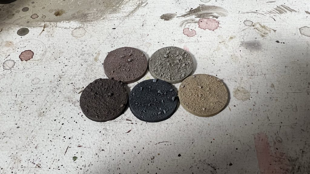 Painting these I follow a pretty standard structure. I prime them (forgot to get a photo) usually via airbrush or spray paint can. Then I basecoat them, give them a wash, and two layers of drybrushing. The first drybrush layer is closer to or just the original color. The second layer is a brighter color to make the texture pop more. For this guide I’m going to whip up five different base themes to show how versatile this method will be. First is a darker soil with grass and shrubs similar to what I’ve been using for my WW2 Battle of France minis. Second is a dry, tan, rocky desert. Third is a quicker variant of my Africa-ish bases I put my ultramoderns on(I use a foliage-lacking version of it for the sci-fi Killwager minis). Fourth is a grey dusty base I envision being decent for urban rubble or maybe some sci-fi applications. Finally I’ll do a yellower desert base.