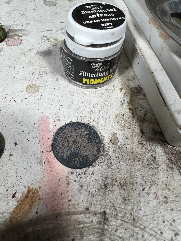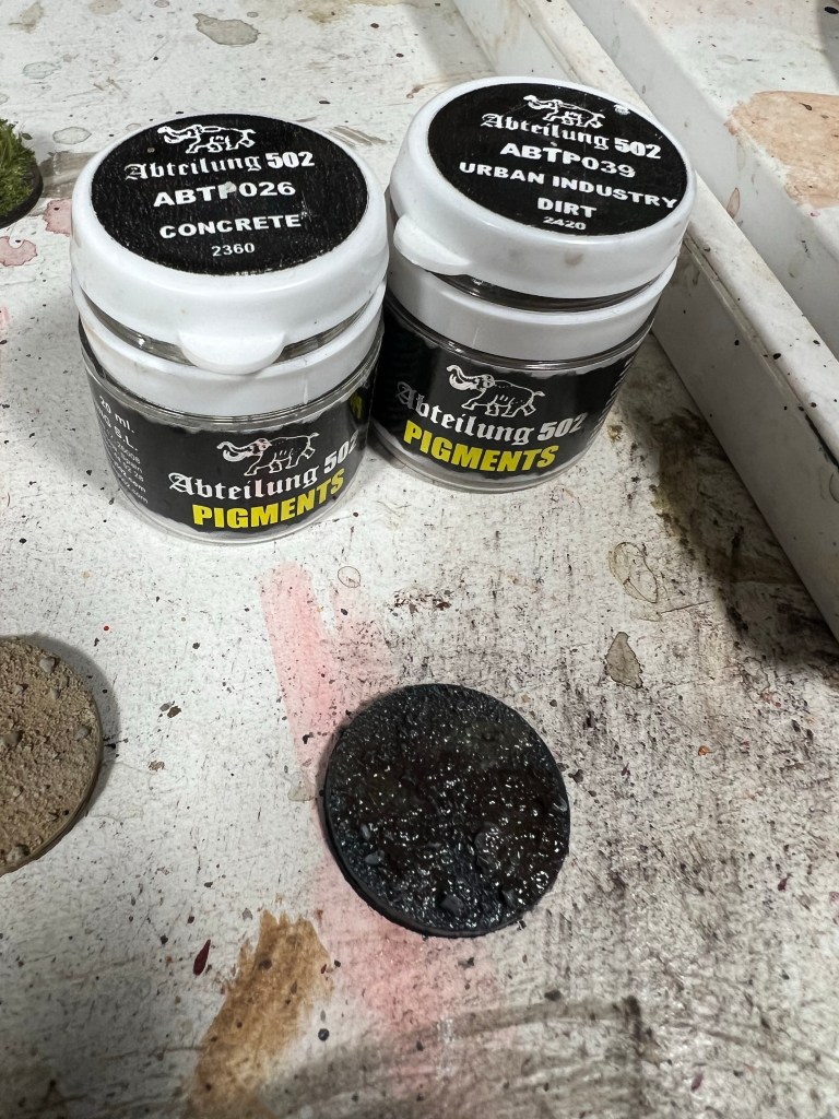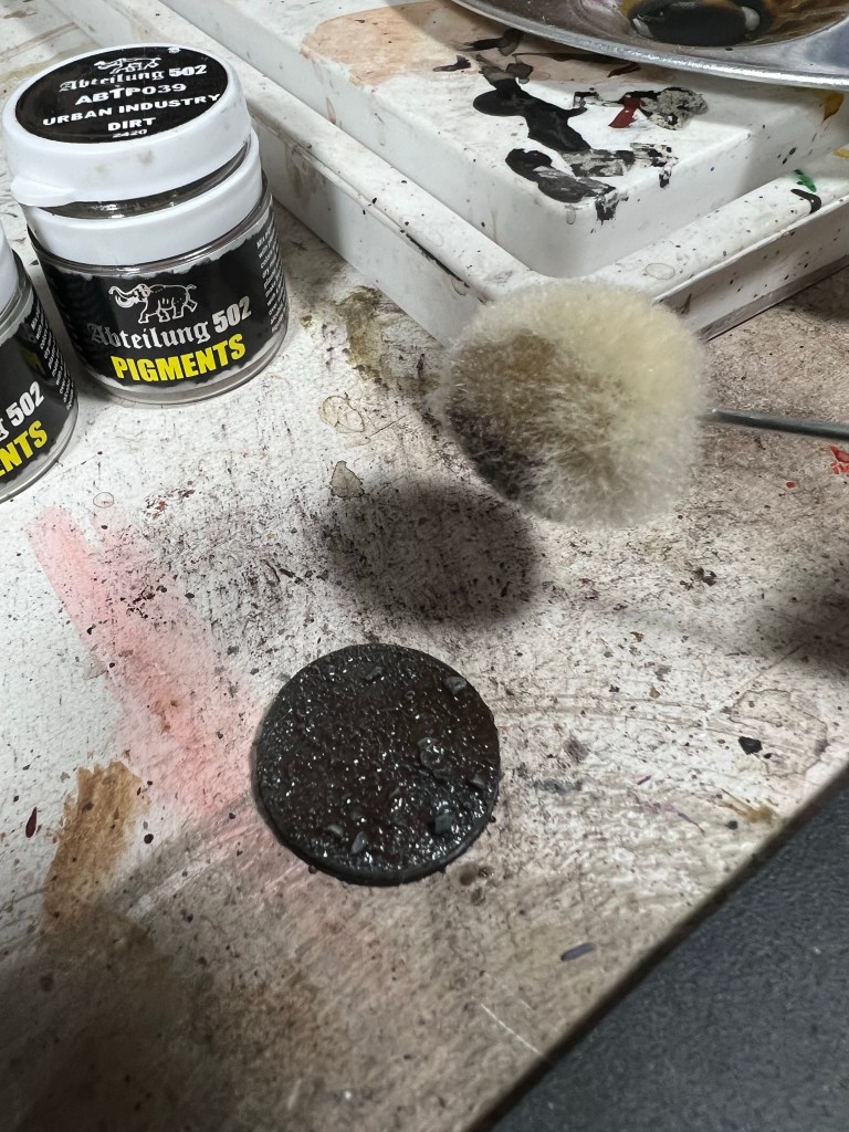 This one I opted to use pigments to get it dusty looking. My pigments of choice this time were Ableitung 502 Urban Industry Dirt and Concrete. I just put (a little too much to be honest) a pile of each where I wanted it on the base. I fix it with mineral spirits then dab away excess like I mentioned above. This also lets you work the pigment around a bit. This step can be repeated to reduce the effect and a clear coat also subdues it a bit. I had to make two passes on this base because it was a little heavy the first time.
