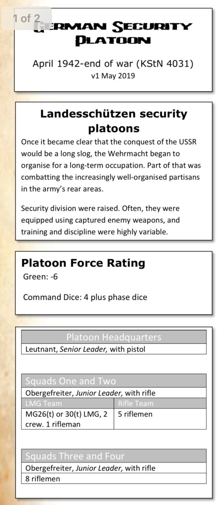 I have some printed MG08/15s and ZB vz. 26 light machine guns that were common in rear echelon platoons who were low on the equipment totem pole. Not everyone could be issued an MG34 or MG42 afterall. I’ll be building a platoon to match the Security platoon structure below. I’ve wrestled back and forth on using a security platoon in a game. They were commonly used in an anti-partisan role in which brutal reprisal tactics were used. That being said as adult wargame enthusiasts we know we are playing a game and we don’t condone the brutal nature of what happened. There is an interesting cat and mouse game that can be played out on the tabletop with partisan raids against supply points or infrastructure. And as I said I am intrigued by forces that don’t have all the shiny toys to rely on. This force and a partisan force fit that bill.