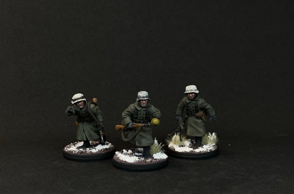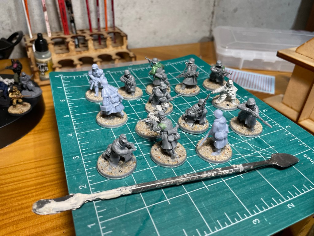 My miniature prepping progress is a little bit slower than normal as I am taking time to sculpt overcoats and winter camouflage smocks onto some of the rifleman. This should give some variety to the sea of German Fieldgrey. It takes about an hour or so of sculpting for each miniature but the prospect of having unique miniatures makes the time investment worth it. They won’t be winning any sculpting awards, but they will do the job.