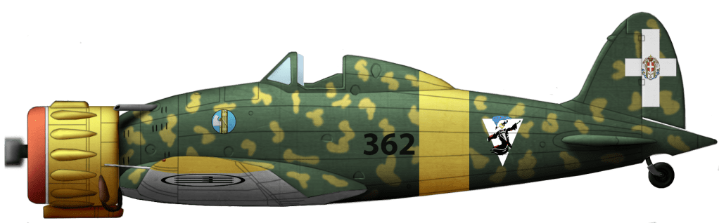 The 22º Autonomous Ground Fighter Group was broken down into 4 Squadrons (Squadriglia) the 359ª, 362ª, 369ª and the 371ª. In the second week of August 1941 the 22º was relocated to the airport at Tudora Romania. Their aircraft were painted in ochre and green camouflage with a yellow band behind the cockpit, yellow engine cowlings, and yellow lower edge of the wings.
