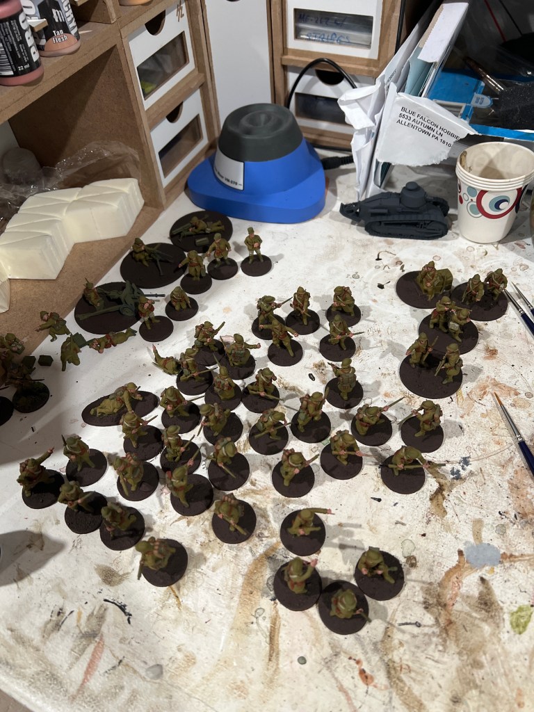 1940 French Platoon: “yeah I’ll print it up real quick how bad could it be” -Me, nearly 4 months ago. So this has been the best I’ve been wrestling all summer. With 65 minis involved it’s made each step long and painful. I’m happy to report I’m down to rifles, helmets, boots and bases to go. I did do one test mini first and it turned out great. Colonel Muller Miniatures has been pumping out new French releases all summer though, so I’m sure I’ll have another 50+ minis to paint for my next batch too.