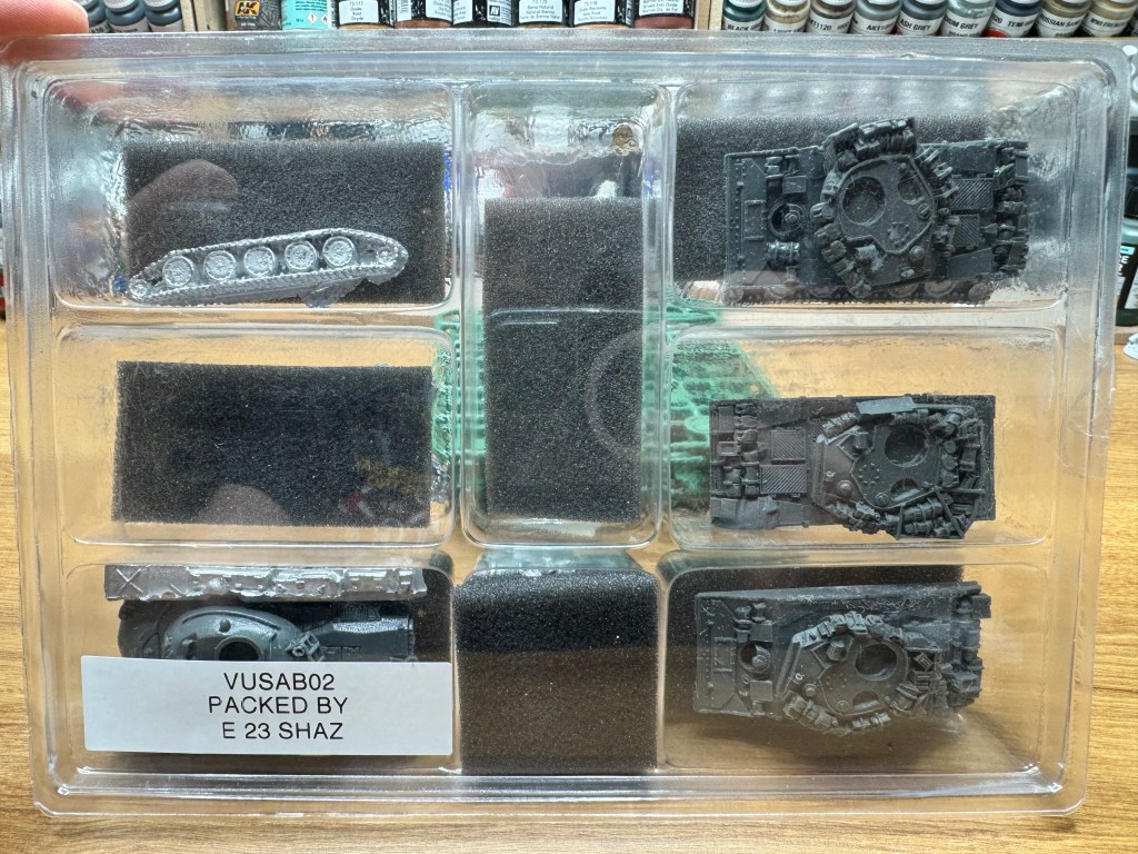 There are three M551 Sheridan Light Tanks and one M48A3 Patton Main Battle Tank contained in a plastic box. The resin and metal kits come secured by foam. Awesomely the M551s are three different sculpts and they feature distinct stowage on their turrets. The hulls and turrets come ready for magnet installation.