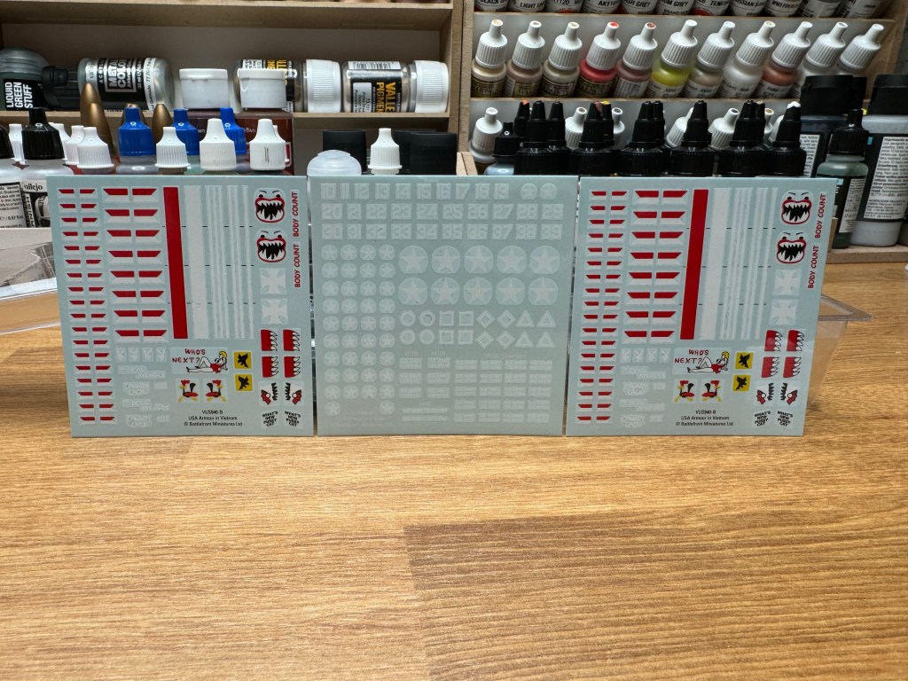 After getting my sweaty mitts on it the first thing to pop out of the box is a combined instruction sheet for all the included vehicles. The instructions seem pretty straight forward though the Sheridan and Patton don’t have an exploded view of the parts. This is kind of a bummer but most of the assembly is straight forward. Sharing the same plastic bag were three sheets of decals. The decals seem nice and flavorful for Vietnam. Vehicle numbers, US stars, vehicle markings, and graffiti are included.