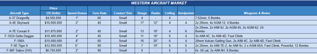 Well, next is Ben and I need to reconvene to play some games, or I need to take up the solo rules and do some alone. Either way we need money to buy more armaments, and doubtless we’ll need some additional planes and pilots in time. What’s available out there for me to buy right now is below: