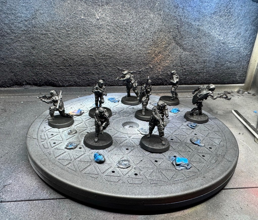 With the prep work done, the next step was priming. For my BLKOUT figures, I know that I will be doing some combination of zenithal highlighting and/or slapchop. So, black primer it is. My go to is Vallejo black primer with a bit of thinner sprayed through an airbrush. I did the whole squad, let the primer dry, and then went over it once more to touch up any spots I had missed.