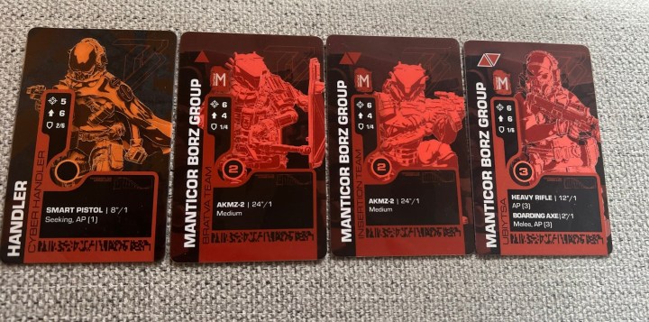 There’s a lot of info to unpack there and I spent some time going through each unit with the rules at hand to make sure I understood what I had available to me. I did the same with the Handler options. Handlers are like your hero/leader type model for a force. There are six universal ones available at the moment, each with its own flavor, indicated by their name such as “Siege Handler”. The unit cards are just like the other ones and going through them I then assembled three lists I’d like to try, making sure to try to use each Manticor option at least one time.