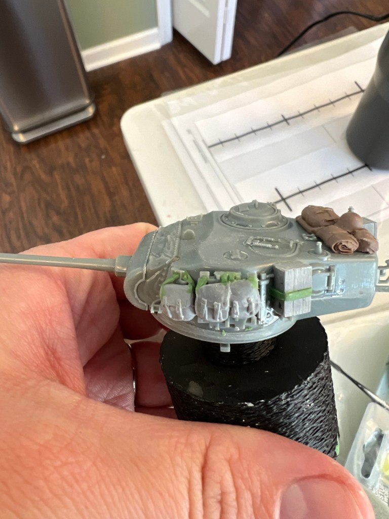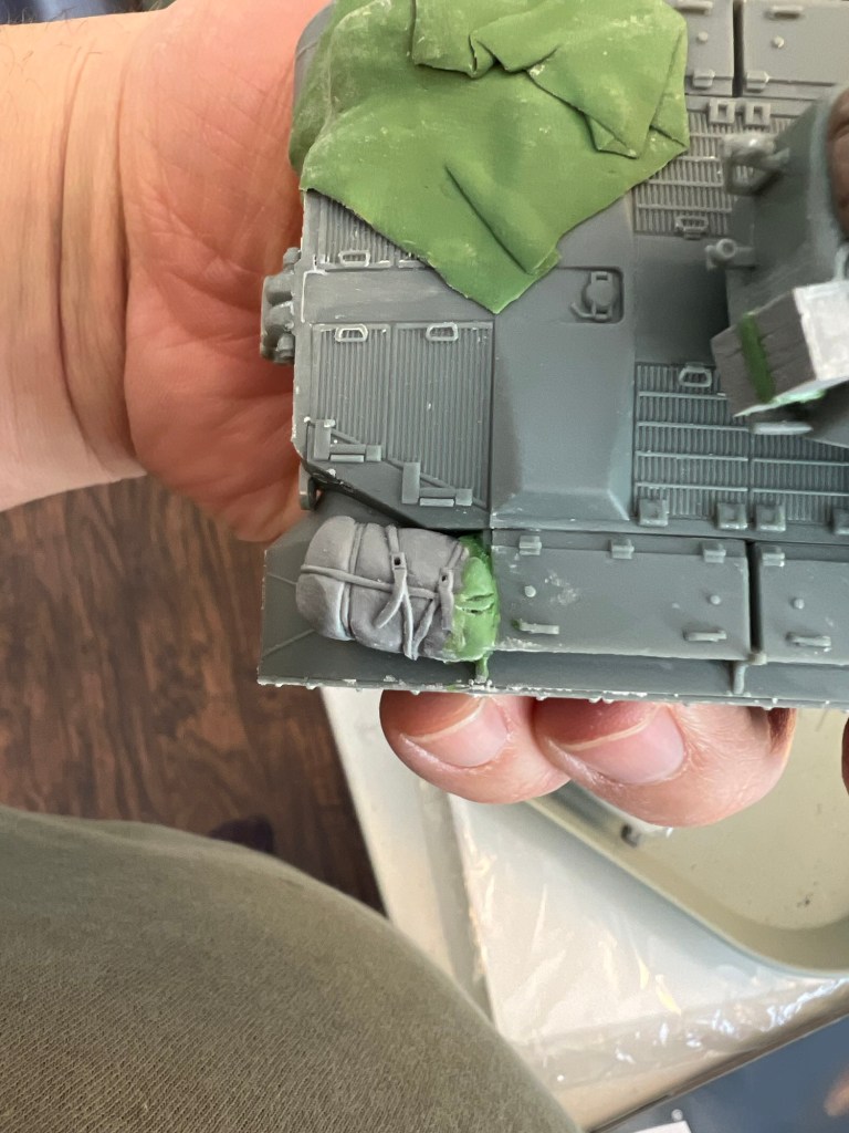 On the turret I added the rucksacks hanging from the spare track links. I had to make the straps for them from green stuff. Speak of green stuff I had to make what appears to be strappings around boxes that can be seen on the turret. I added some stowage bits on top that looked close-ish.