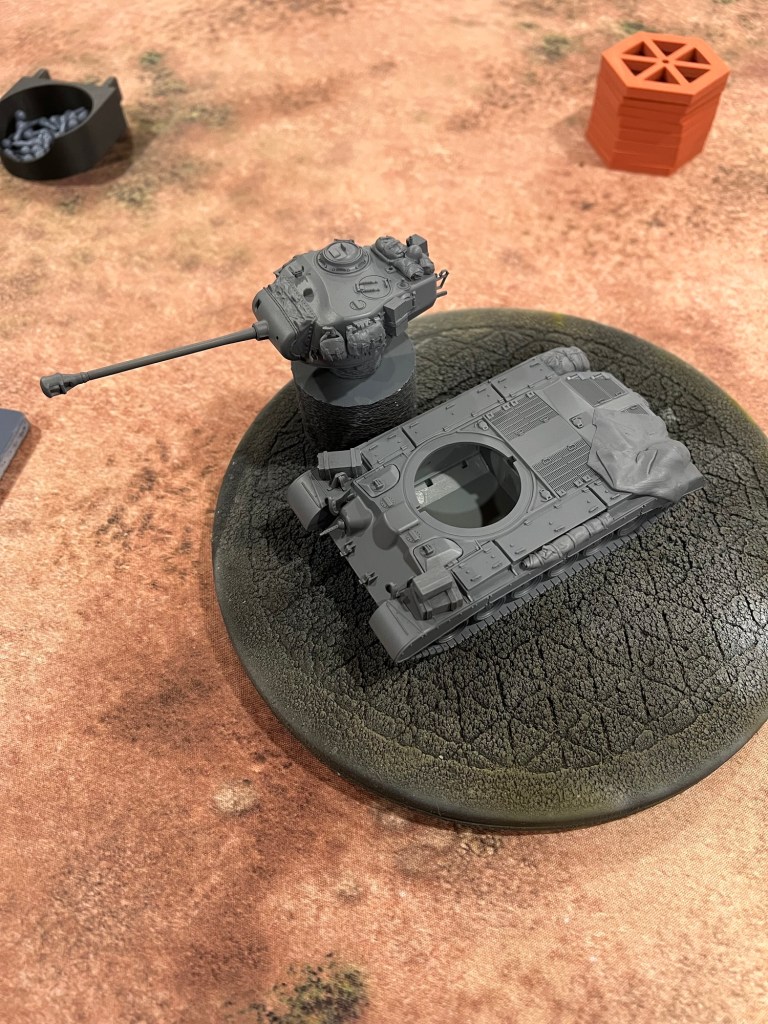 I assembled the Pershing kit, which like all Rubicon kits was a pleasure. With the base tank assembled I went through my large bin of 3d printed and ValueGear 28mm stowage looking for bits and bobs to make the correct items, or close to them, from the photos.