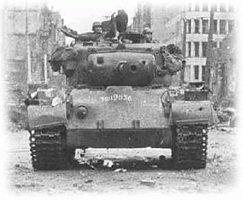Though the first units were still technically T26E3s I’ll refer to them as the M26 Pershing from here on out. The first of the Pershings arrived in Antwerp in January 1945, having been ordered overseas at the height of the Battle of the Bulge the month before. The first combat engagement for the new tank came on February 25th 1945 by the Third Armored Division near the Roer River. The next day saw the first combat loss for the M26 as a Pershing named Fireball was knocked out by a German Tiger in an ambush. However, it was repaired and returned to service in early March. During the battles in late February the Pershing claimed several victories including one Tiger and two Panzer IVs. As February turned into March the Third Armored moved towards Cologne.