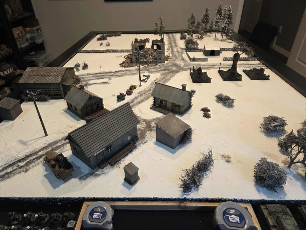 We did Soviets vs. Germans somewhere near Cherkassy, Ukraine in December of 1943. I busted out the Ardennes board for use as a Eastern front winter landscape. I try to make most of my boards a multi-functional as possible to get the most bang for my buck.