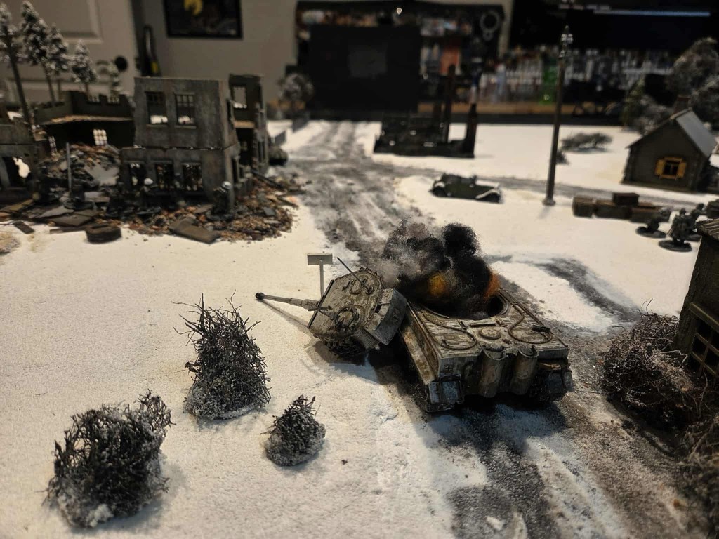 As it was just a learning game for Doug we kept it simple and just did a straight up fight for destroyed units. I don’t remember all the details, but some highlights- His T-34/ 85 snuck up to the ruined factory to challenge the Tiger from around the corner. It ended badly for the Tiger with a well-placed shot by the T-34. Needless to say if this would’ve been a competitive game that wouldn’t have been good as that was a 1/3 of my points up in smoke! He also made quick work of the 222 armored car as well with his KV-1 tank.