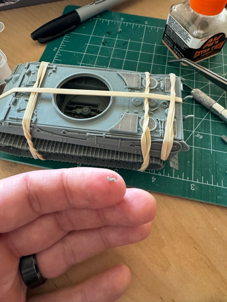 Now I am not an expert modeler, but I can hold my own with a hobby knife most of the time. That said the King Tiger kit was a beast. Rubicon’s website lists 242 parts across five sprues inside the massive box. The components fit together well with only the joining of the upper and lower hull pieces needing a little rubber band persuasion. I don’t think it was an issue with the kit so much as that the part got a bit twisted inside the packaging and developed a memory of that shape. You’ll notice a few photo-etched air intake grilles. The inclusion of photo-etched parts is pretty rare for a wargaming model, but it is a super nice touch.