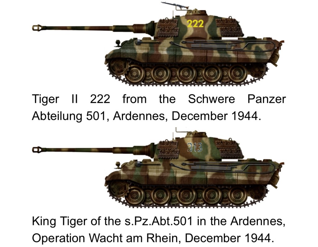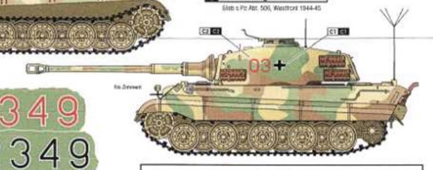 While I liked the above Seelow Height’s paint scheme I will be saving it for another King Tiger (though the thought of building another makes me shudder.) Instead, I am basing my Tiger II on the 506th Ardennes scheme pictured below. Actual pictures of the unit’s Konigstigers in the Ardennes are hard to come by. Again I guess no one had time to snap photos during the dash to the Meuse River.