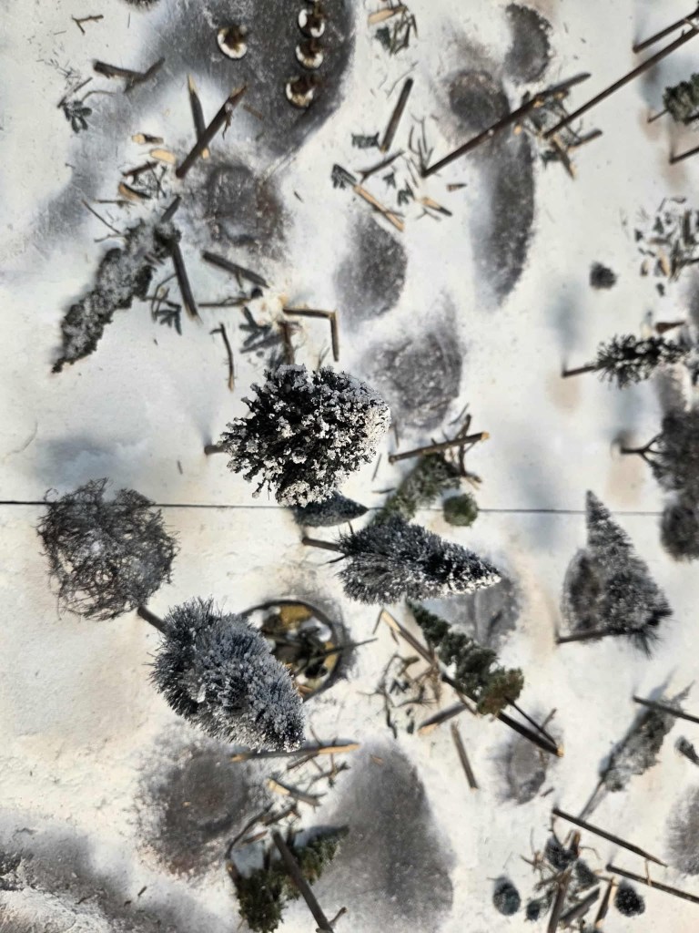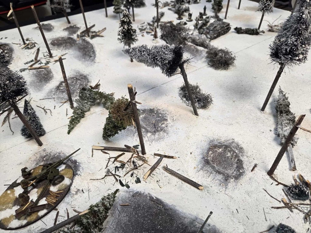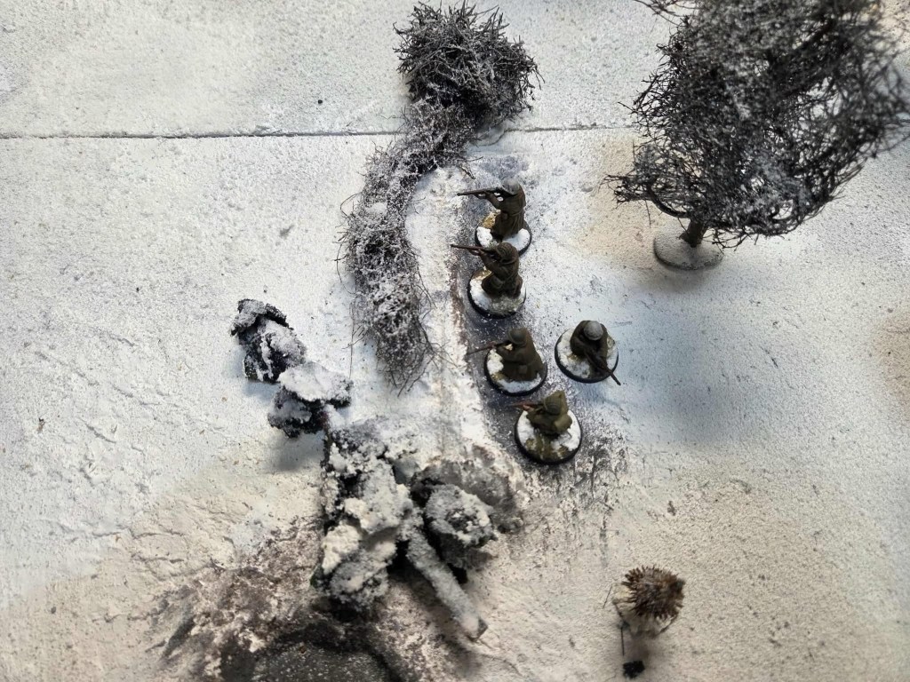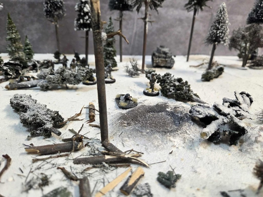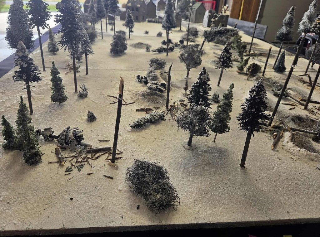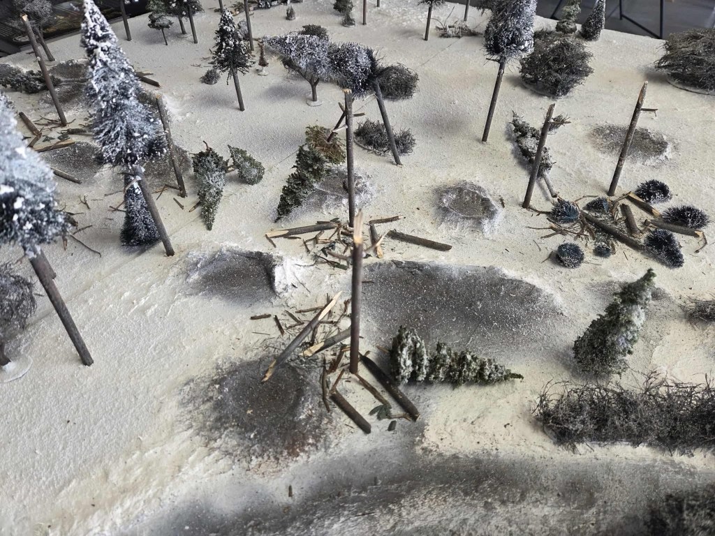 The broken trees were easy. Just snap and rip apart painted dowels as needed. The snow on the buildings is a flex paste/ woodland scenic flock mix. Iโm sure there are some things Iโm missing, but those are the main components of the build.