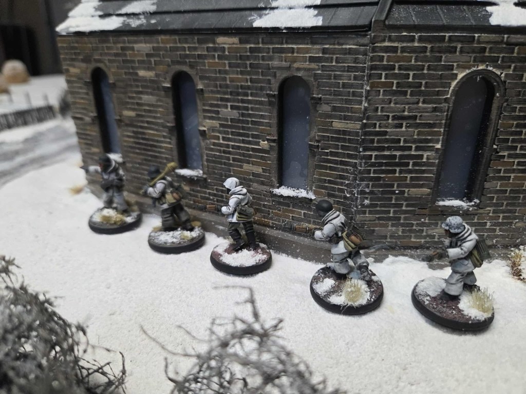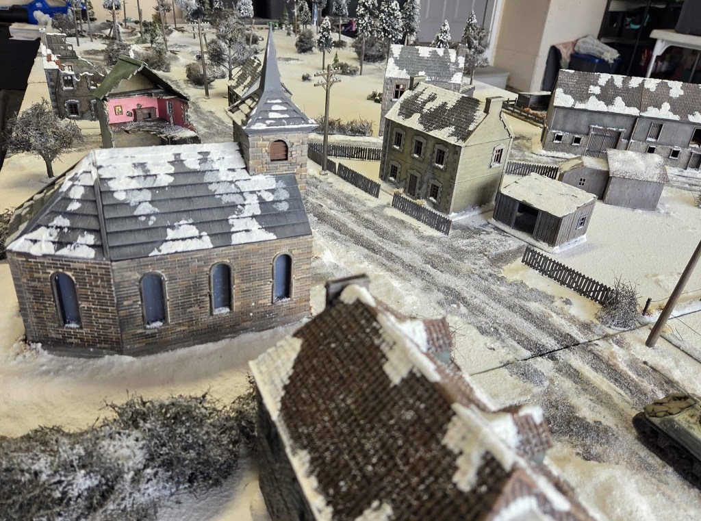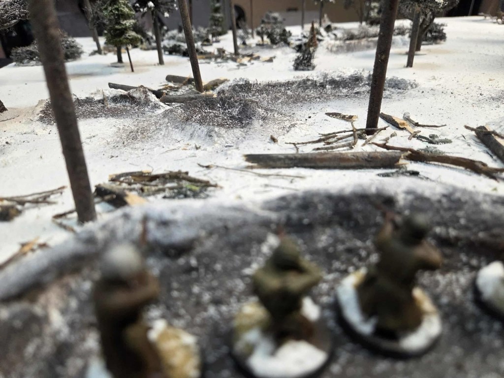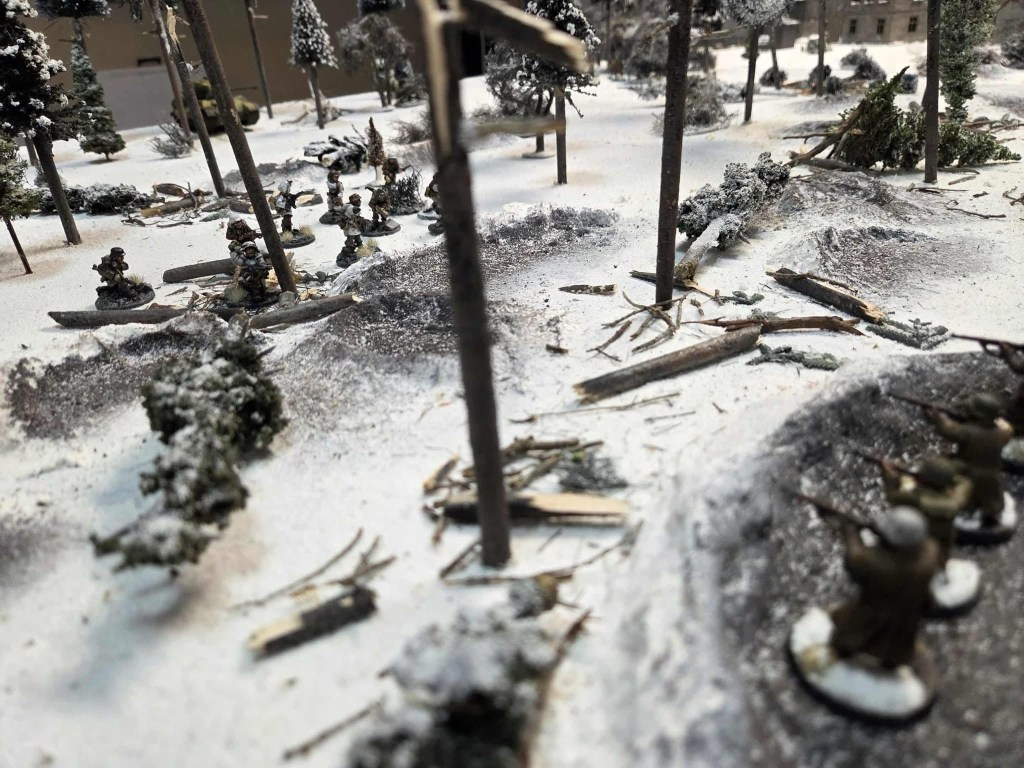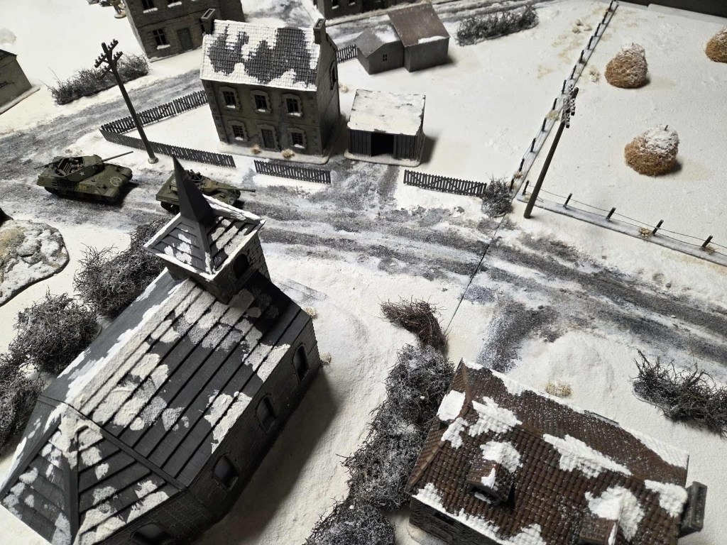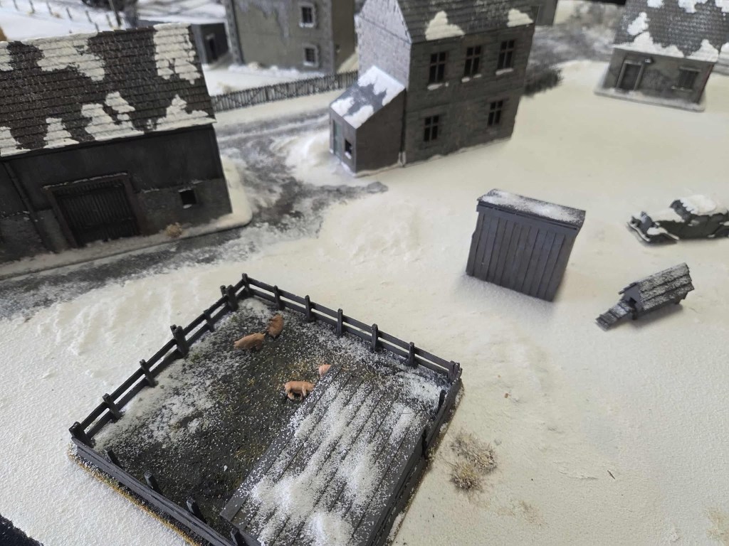 The board itself is 4 ft x 10 ft. Made up of three 2×4 panels and one 4×4 panel for a little flexibility in modulation. Two of the panels are 1 ยฝโ polystyrene foamboard the two woods ones are made of some old OSB panels I had as previous terrain boards and textured over. The snow was made with sculptamold, white primer, flex paste, white spray paint and woodland scenics snow flake flock. The buildings are a mix of fdm prints, mdf kits, and scratch built. The models are a mix of my armies and my friends Ben and Evan. (Thank you gentlemen for the loan of troops!)