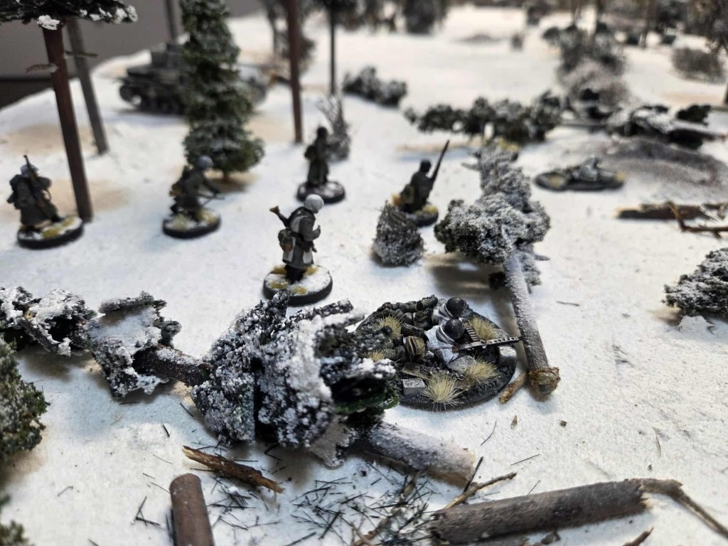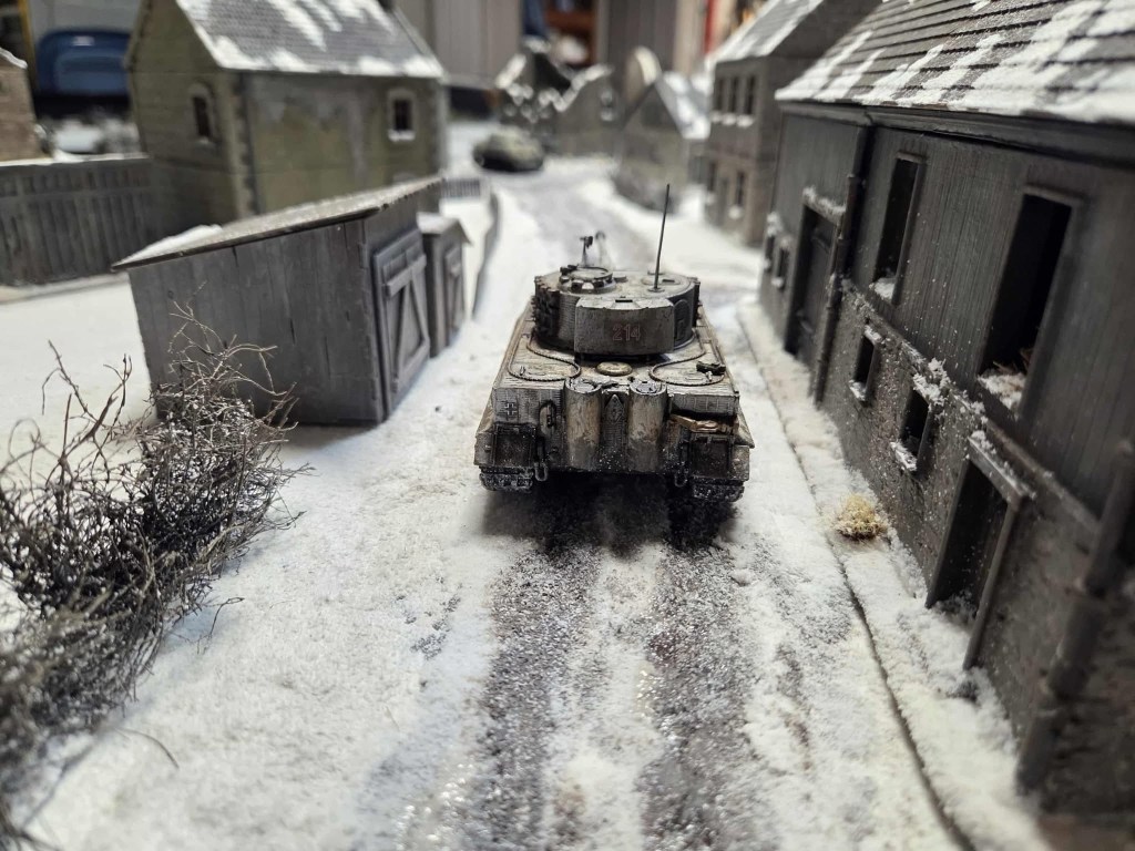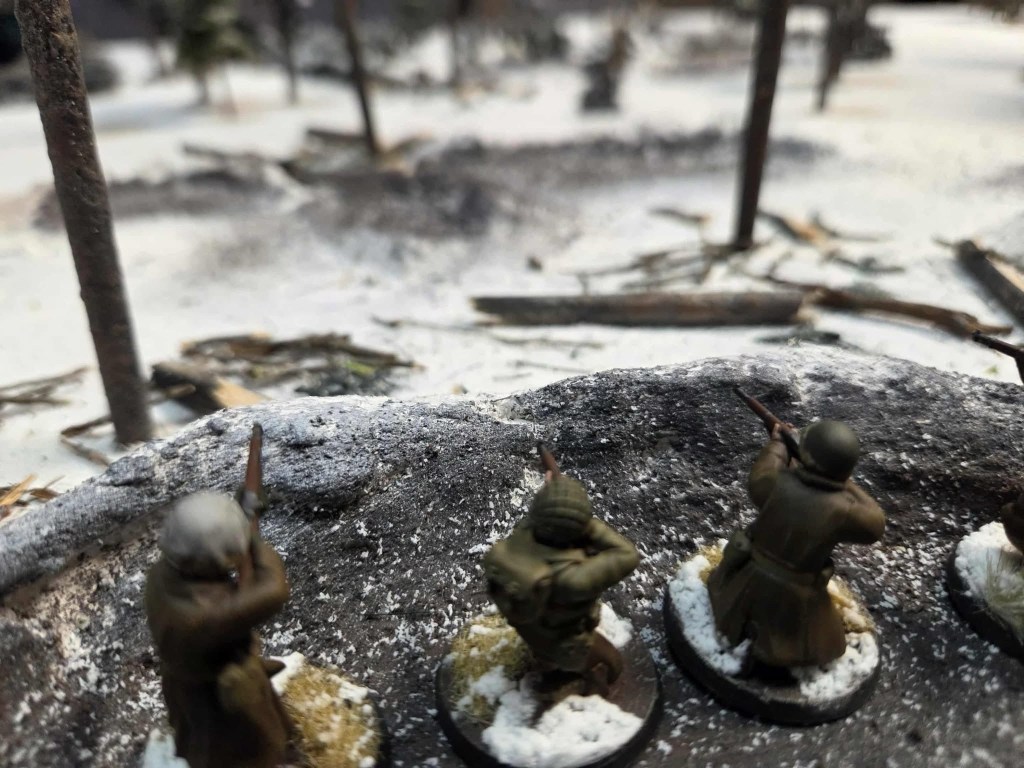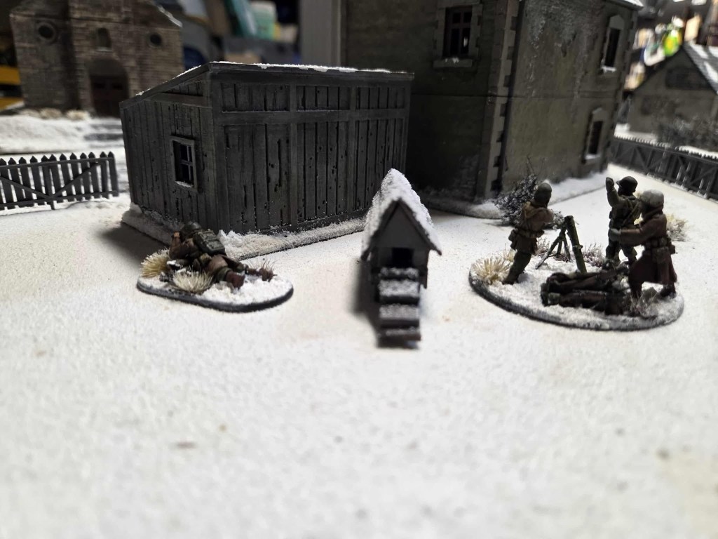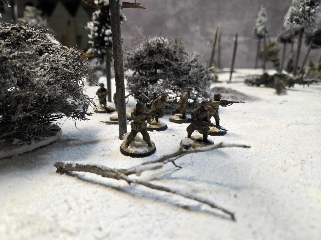 The board itself is 4 ft x 10 ft. Made up of three 2×4 panels and one 4×4 panel for a little flexibility in modulation. Two of the panels are 1 ยฝโ polystyrene foamboard the two woods ones are made of some old OSB panels I had as previous terrain boards and textured over. The snow was made with sculptamold, white primer, flex paste, white spray paint and woodland scenics snow flake flock. The buildings are a mix of fdm prints, mdf kits, and scratch built. The models are a mix of my armies and my friends Ben and Evan. (Thank you gentlemen for the loan of troops!)