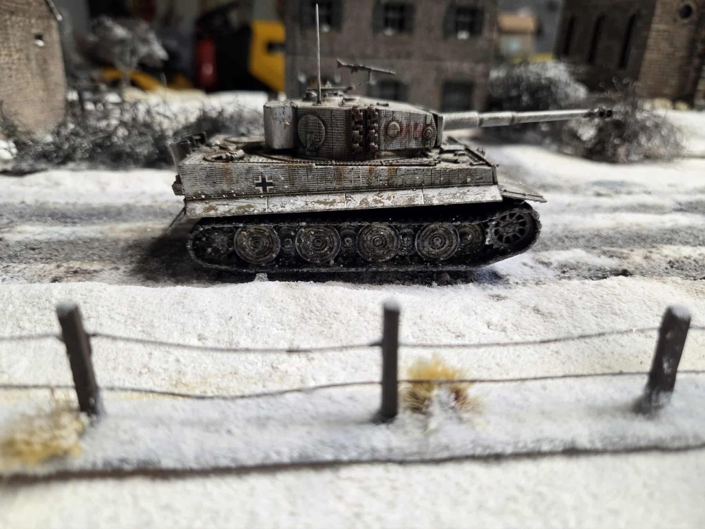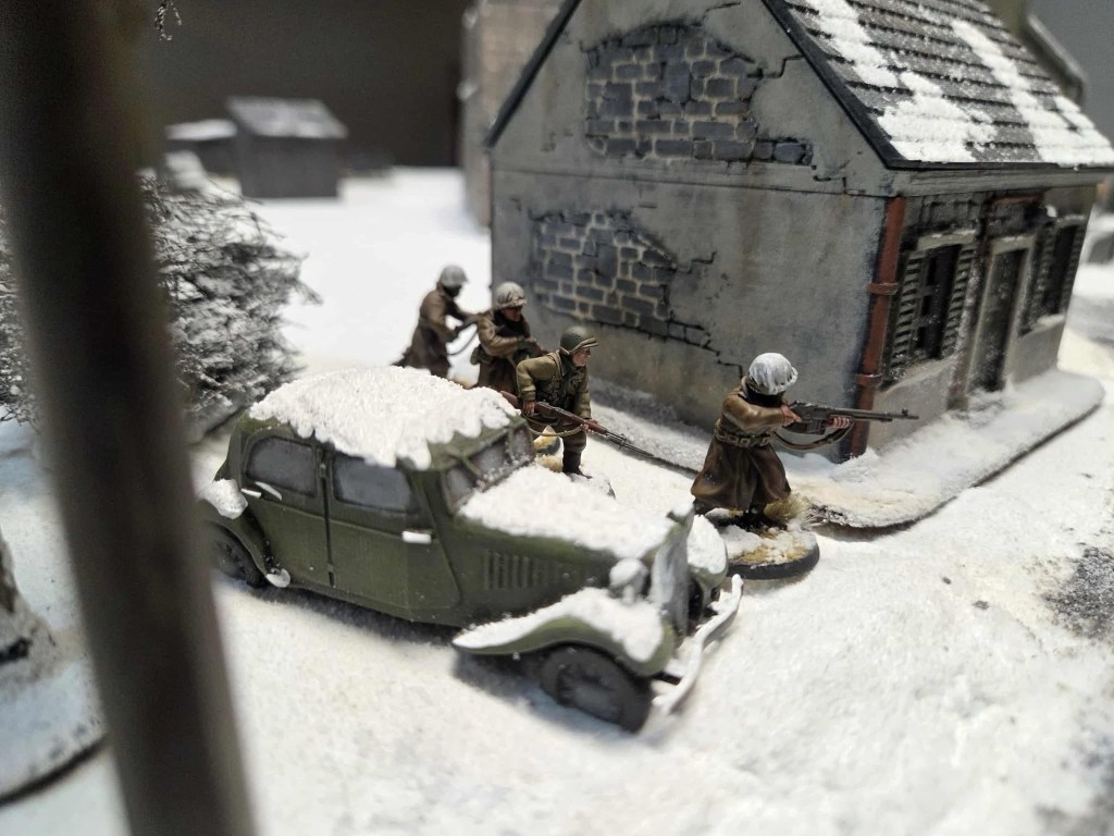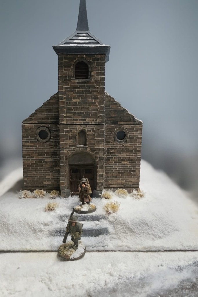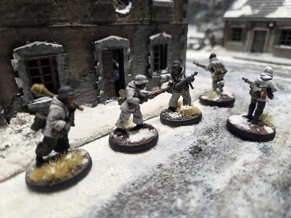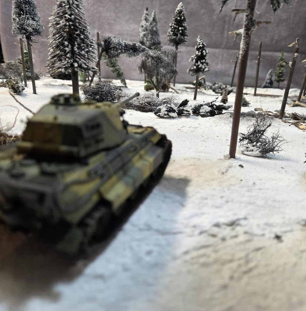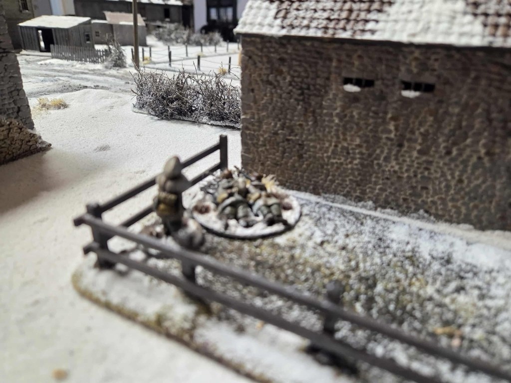 The board itself is 4 ft x 10 ft. Made up of three 2×4 panels and one 4×4 panel for a little flexibility in modulation. Two of the panels are 1 ยฝโ polystyrene foamboard the two woods ones are made of some old OSB panels I had as previous terrain boards and textured over. The snow was made with sculptamold, white primer, flex paste, white spray paint and woodland scenics snow flake flock. The buildings are a mix of fdm prints, mdf kits, and scratch built. The models are a mix of my armies and my friends Ben and Evan. (Thank you gentlemen for the loan of troops!)