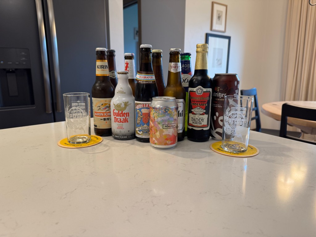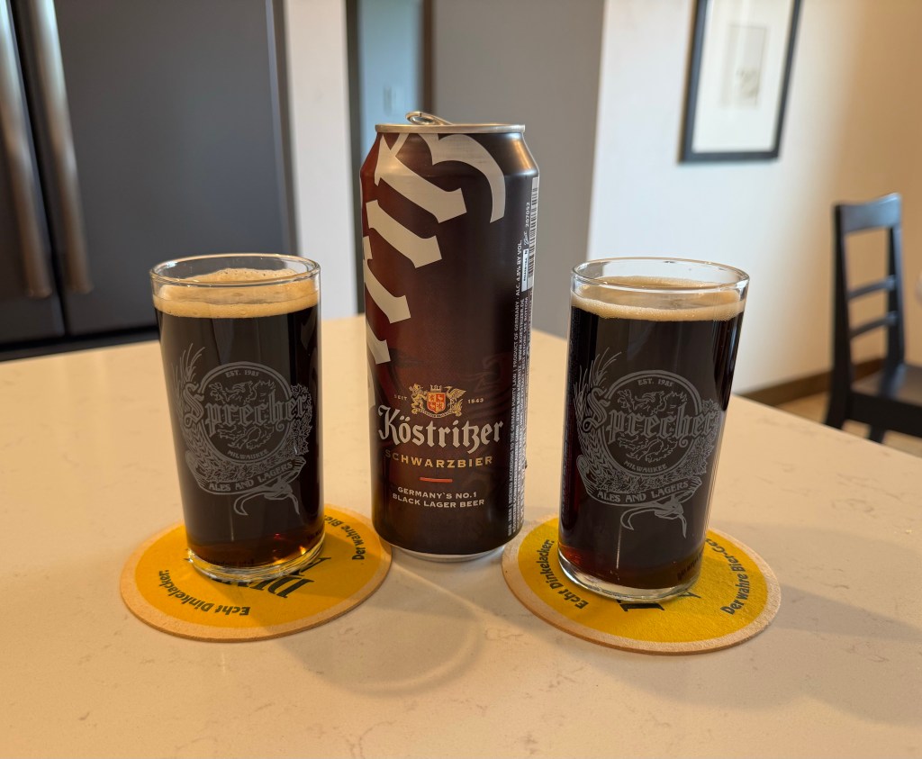 Above is the group photo of the 11 different beers and our tasting equipment. We had 11 unique beers as we bought two Taddy Porters on Evanβs recommendation (spoiler it was a good recommendation.) Strangely enough, Italy wasnβt represented in the solo beer aisle besides a non-alcoholic beer. Our group of brews included a slew of different brewing styles and tastes. We figured we should kick off The June 2025 World War II Beer Sampler with a classic German brew, the black lager.