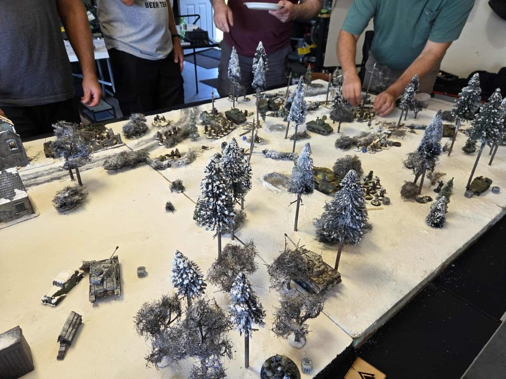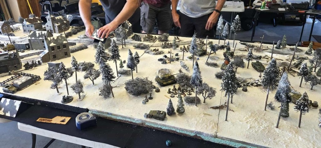 The Battle for Bastogne Part 2 of 2. Bastogne was the focus of our 2025 Big Ass Bolt Action Battle (BABAB). We played with roughly 4,700 pts of Germans vs. 4,300 pts of Americans on the outskirts of Bastogne. Despite it being a warm and sunny fall day just outside my garage I attempted to convey the cold of the Ardennes with the terrain.