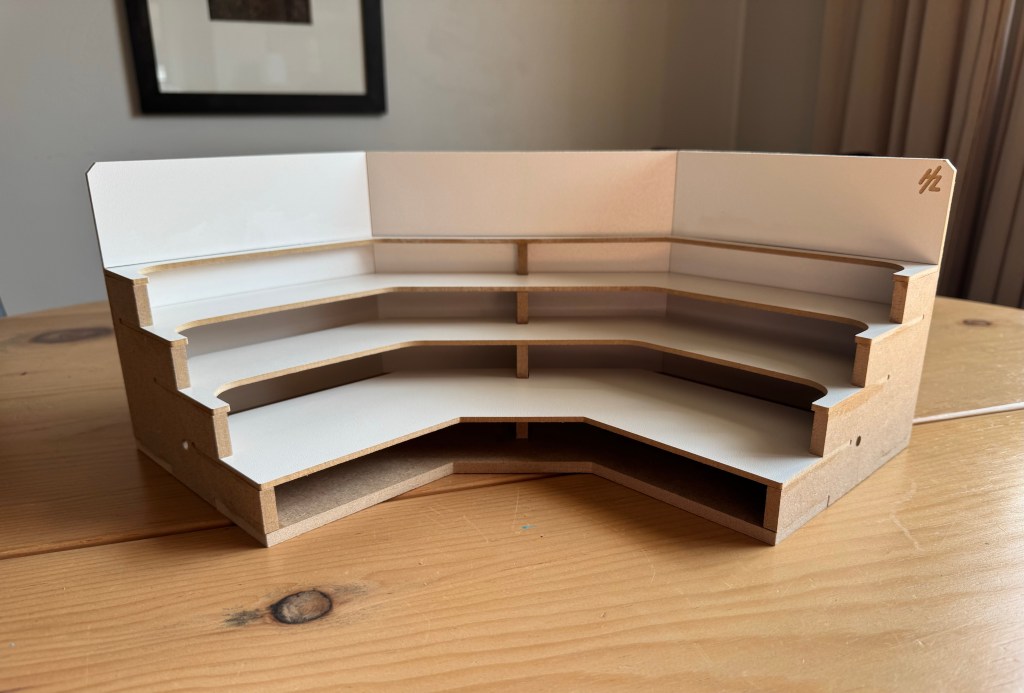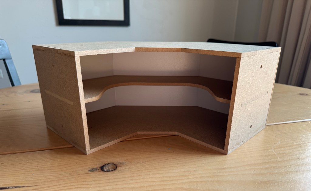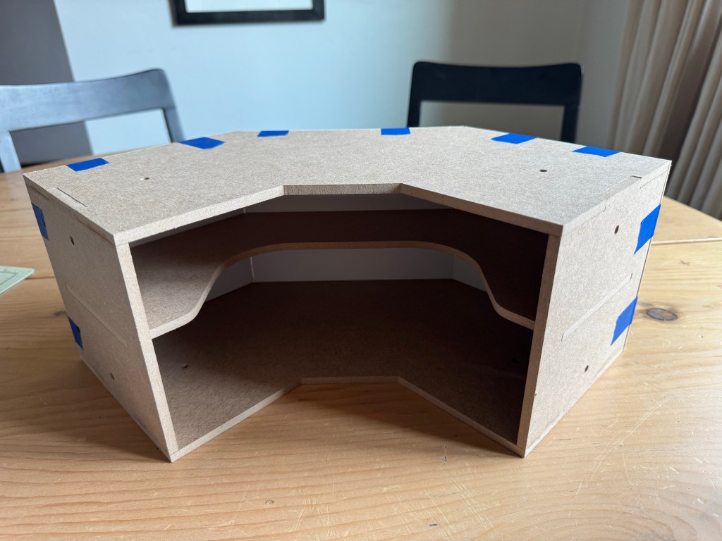 My bad on this one, I didn’t take assembly process photos. I was distracted with wrangling my 4 year old. This kit requires you start by cutting the components apart. The first assembly is attaching the center support to the base plate. This is followed by gluing the side walls to the base plate. Then each shelf deck is laid down on top of the middle support and into the keyed openings on the side walls. Everything fit together very tightly (in a good way) and construction took about half an hour.
