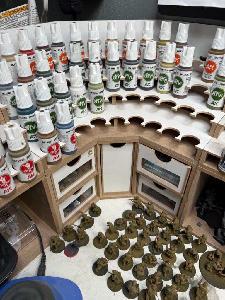 Evan here barging into Ben’s article to say I’ve had a hobbyzone corner unit for a good six years now. Unlike the racks above I have the unit with drawers and the fitted bottle rack for 16ml bottles. I’ve found use for the small drawers to hold various things like small decal sheets or piles of printed or extra kit stowage. Here’s a few photos for a taste of a different setup: