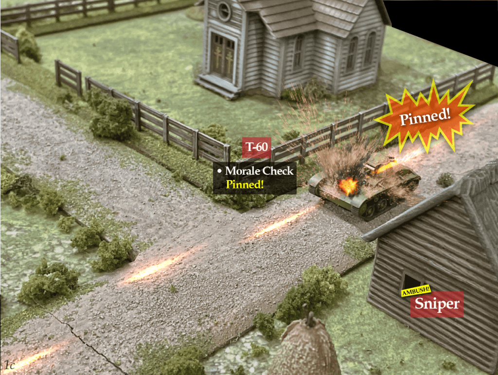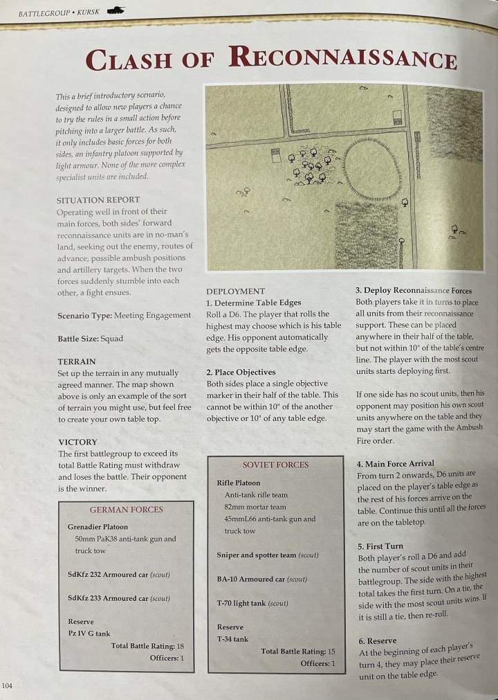 This scenario is in the Battlegroup Kursk book, and is geared towards a demo/learning game of Battlegroup. It’s a Squad sized game, so relatively quick. This is played in 15mm, on a 4×6 table. I’ve matched the table the best I could, along with the army lists. The minor change I’ve made is a Soviet T-60 instead of T-70, as I didn’t have a T-70 painted.