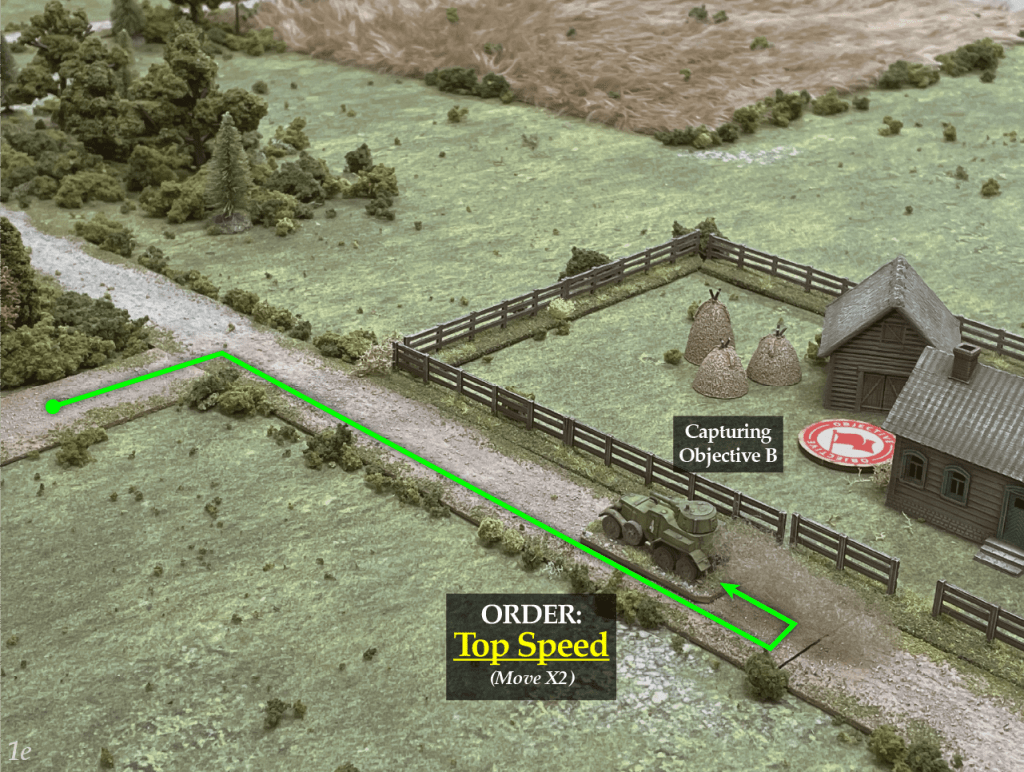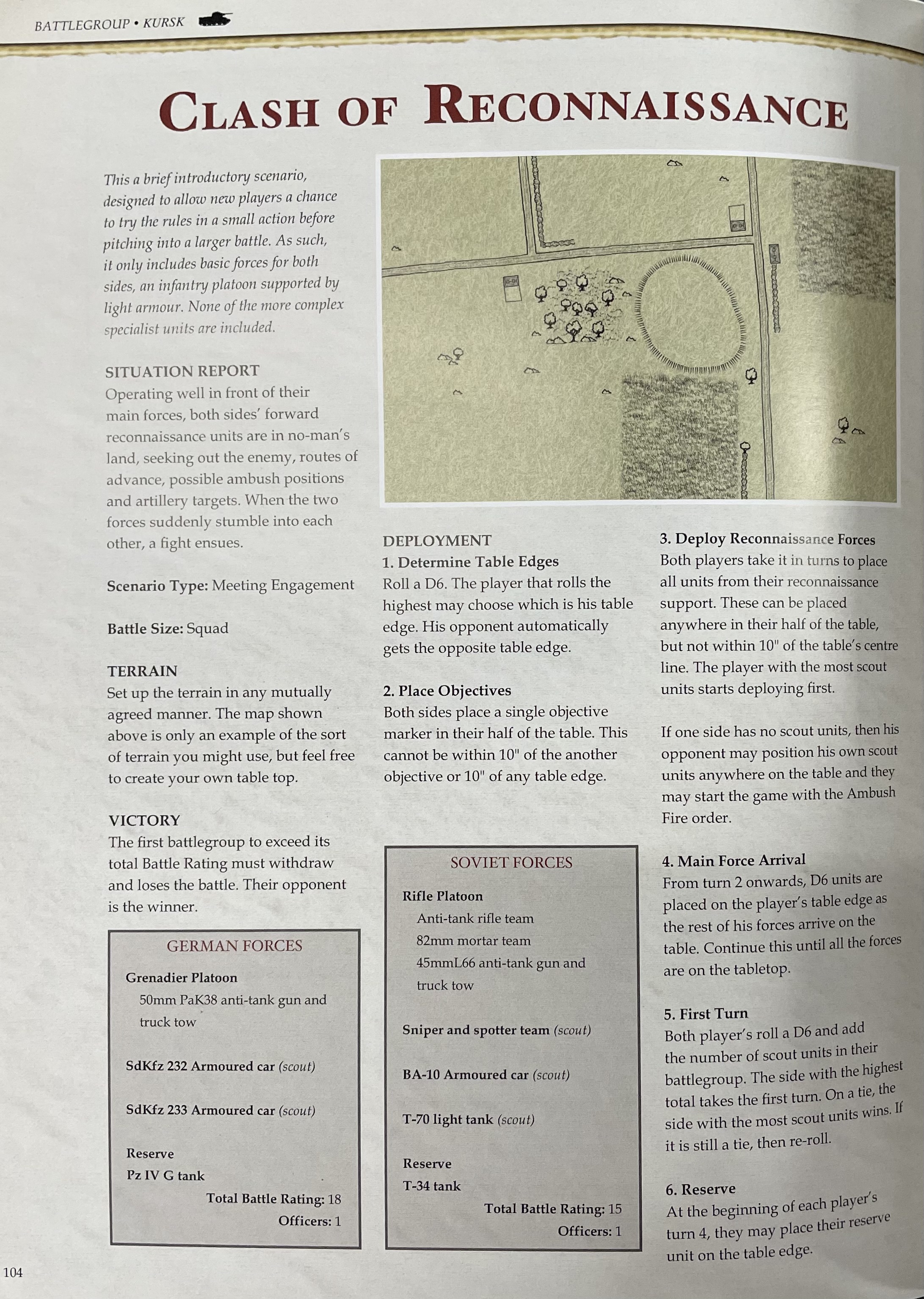 Deployment starts with placement of Objectives and each sides Scout units. Objectives are placed in each sides half, not within 10″ of any table edge. Units are placed alternately. Which side places first is determined by a die roll (D6 +number of scout units)