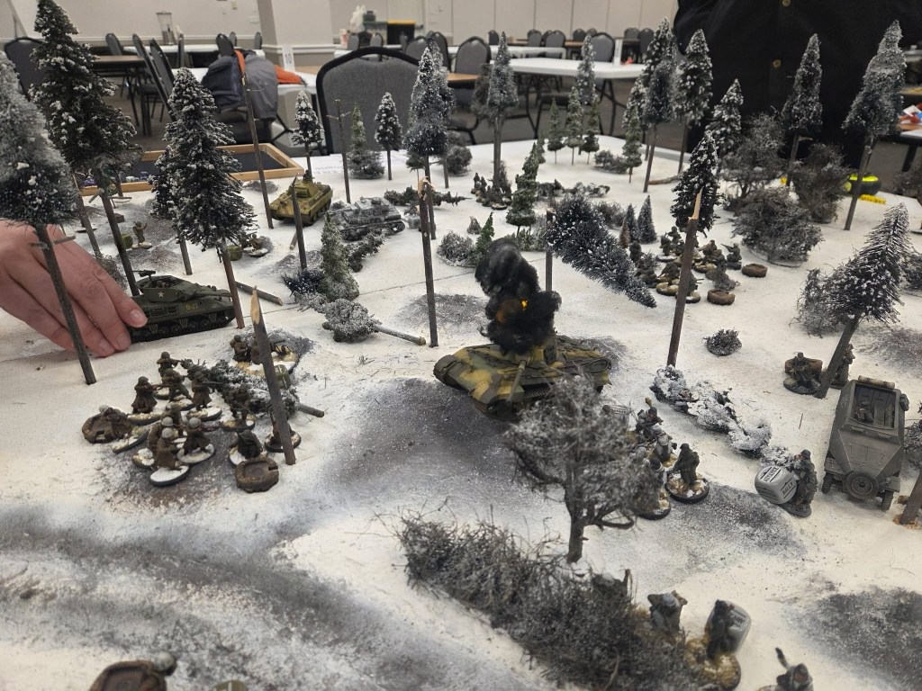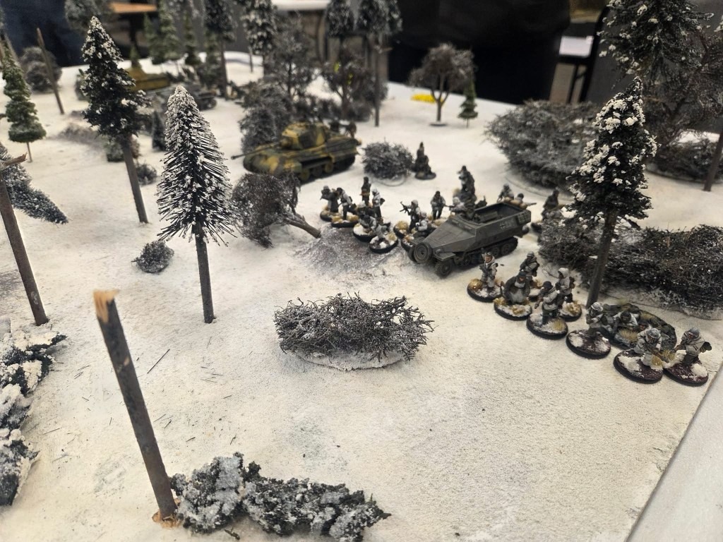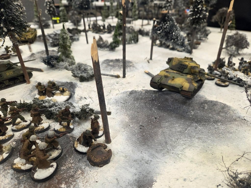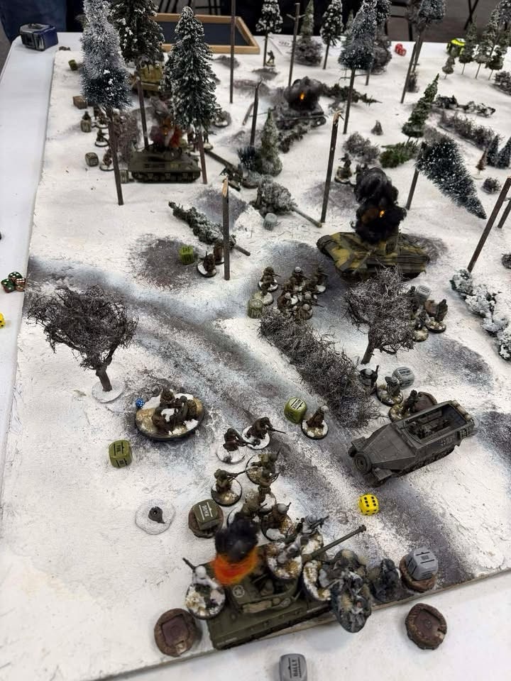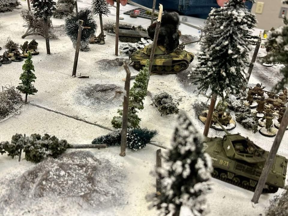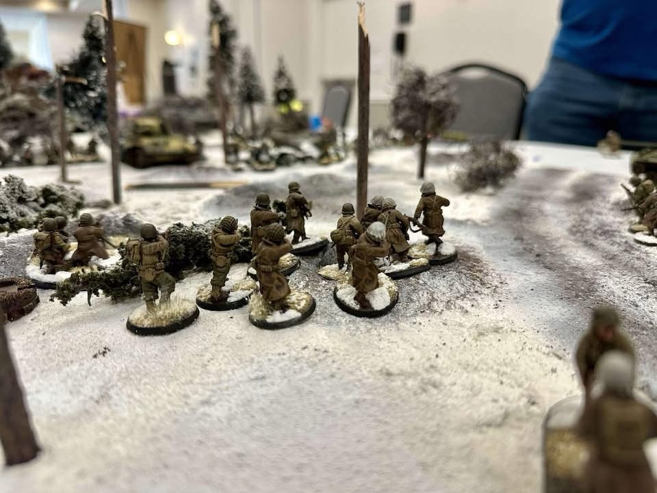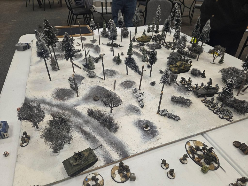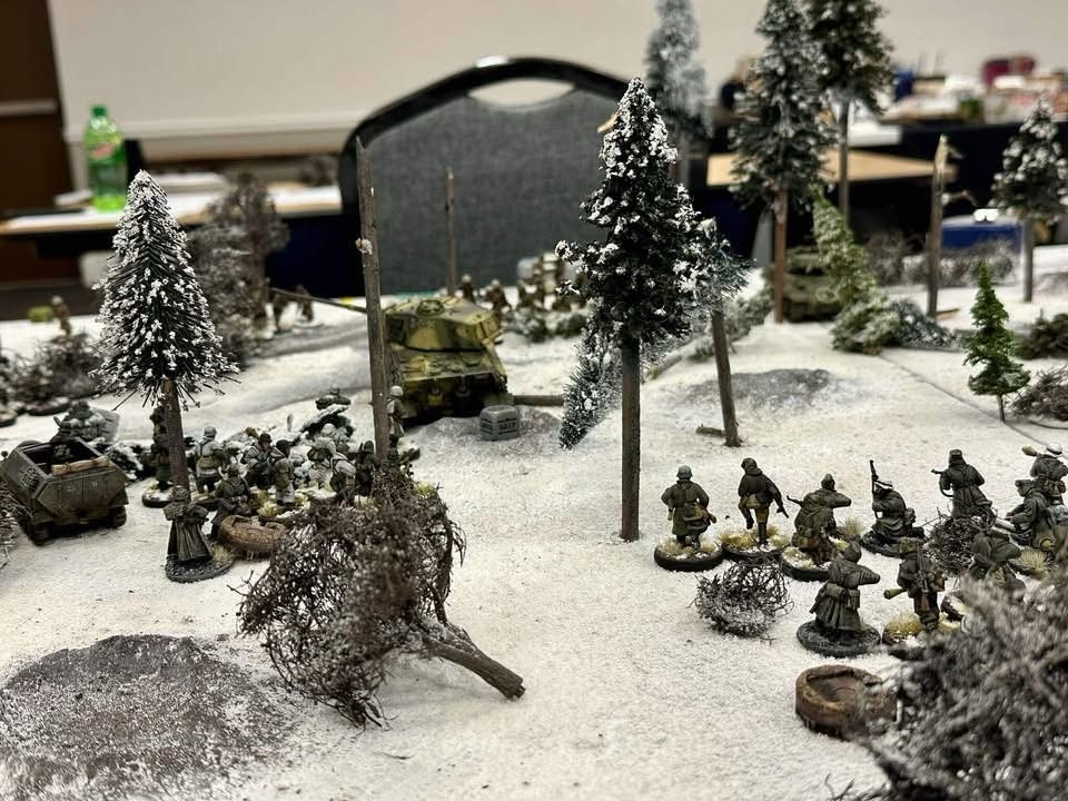 This year I ran “Hold the Line – Siege of Bastogne” – for Bolt Action with the 101st holding the line in the Ardennes. I based it mostly on the scenario from the Battle of the Bulge campaign book. I purposely left the board 4×4 instead of 6×4 and fully covered in woods to really bring home the feeling of lack of visibility and confinement being in the frozen forest. I had four players and each side had around 1850 pts.