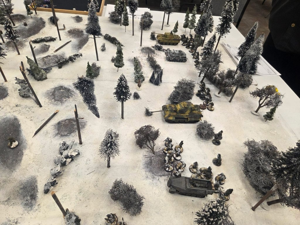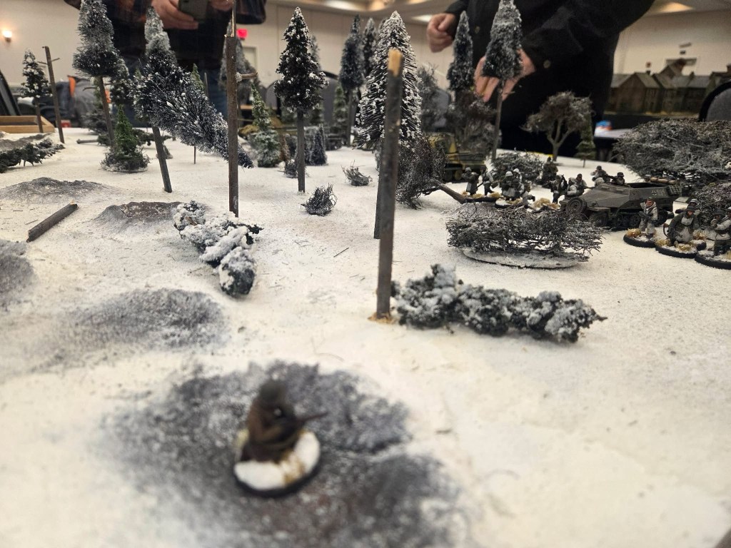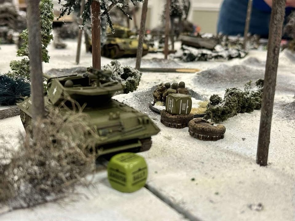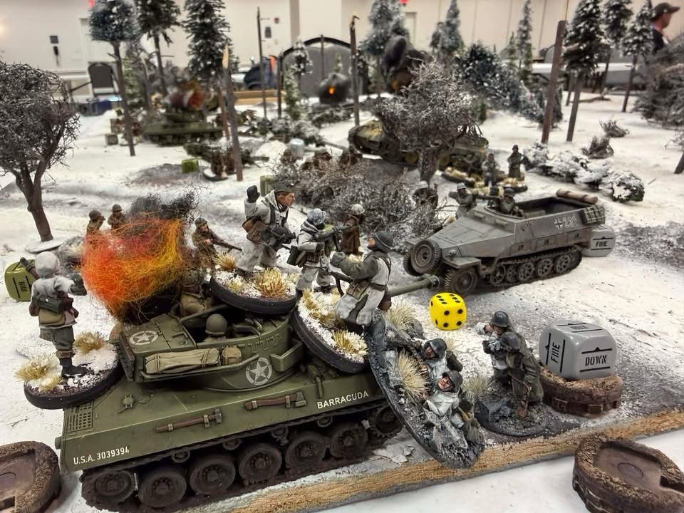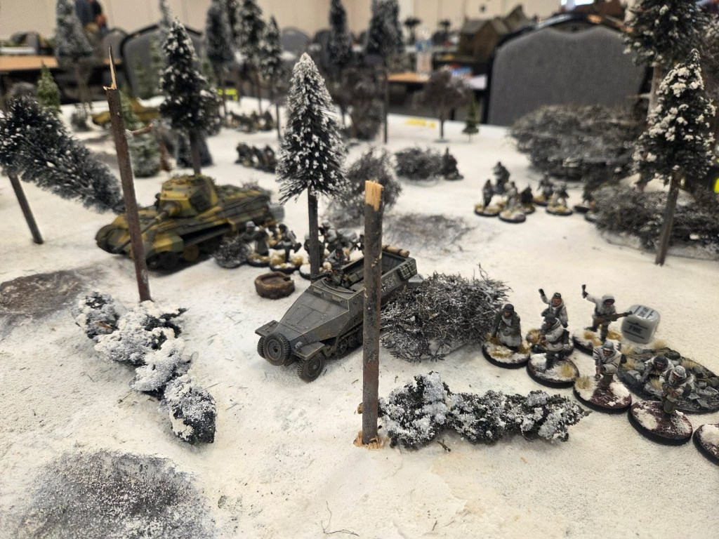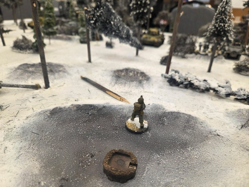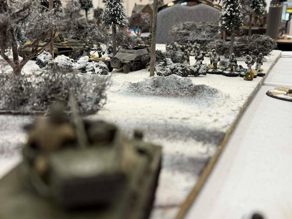 This year I ran “Hold the Line – Siege of Bastogne” – for Bolt Action with the 101st holding the line in the Ardennes. I based it mostly on the scenario from the Battle of the Bulge campaign book. I purposely left the board 4×4 instead of 6×4 and fully covered in woods to really bring home the feeling of lack of visibility and confinement being in the frozen forest. I had four players and each side had around 1850 pts.