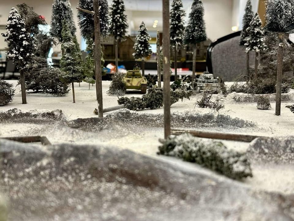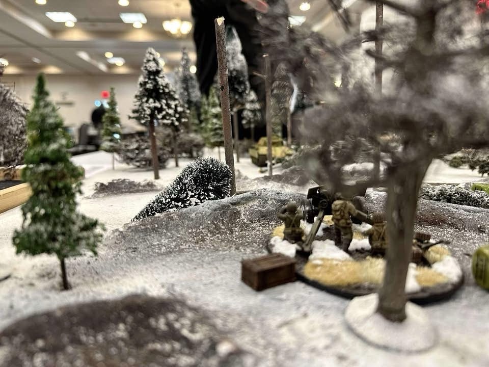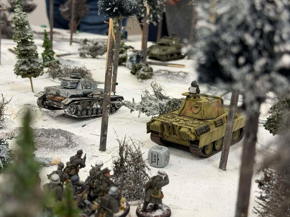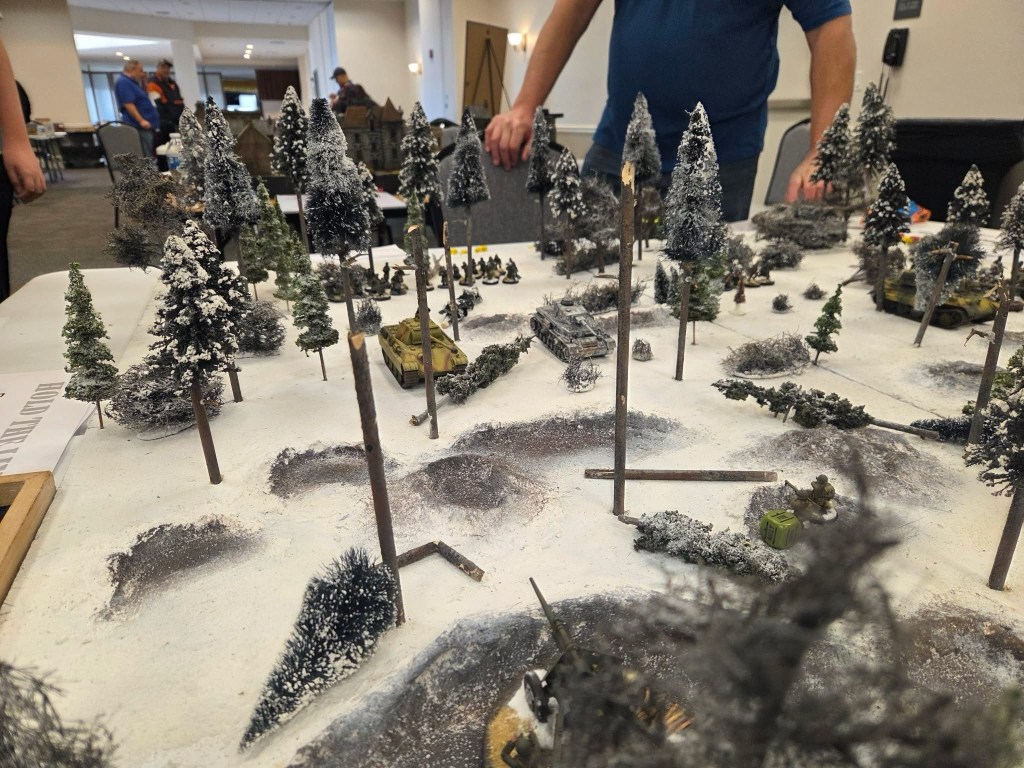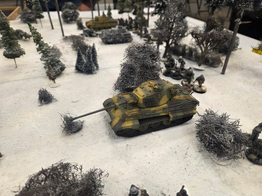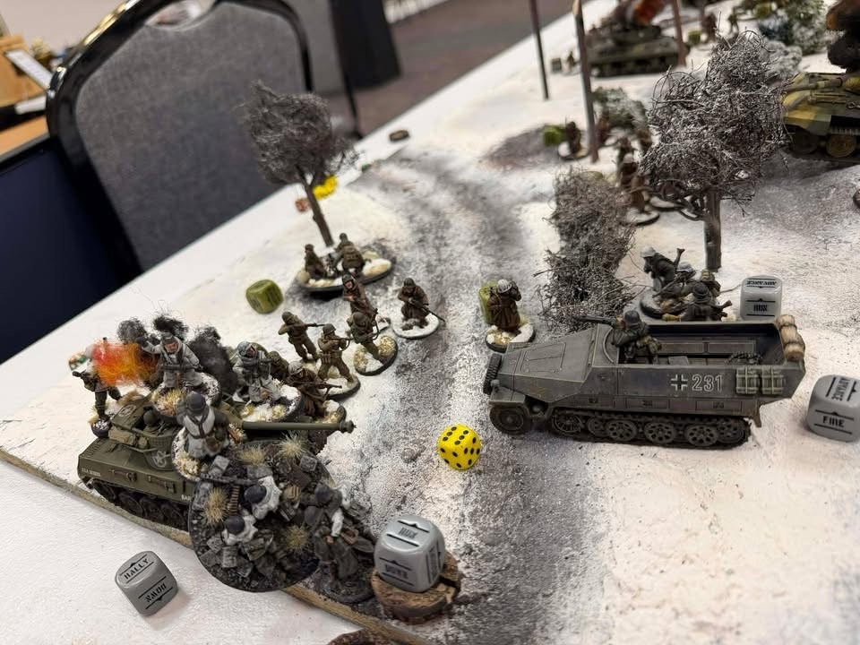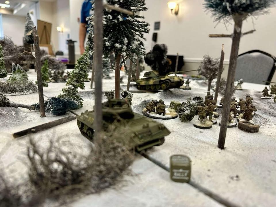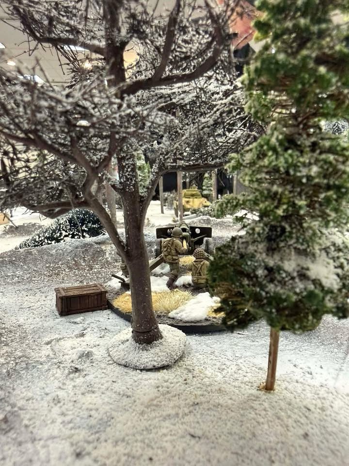 This year I ran “Hold the Line – Siege of Bastogne” – for Bolt Action with the 101st holding the line in the Ardennes. I based it mostly on the scenario from the Battle of the Bulge campaign book. I purposely left the board 4×4 instead of 6×4 and fully covered in woods to really bring home the feeling of lack of visibility and confinement being in the frozen forest. I had four players and each side had around 1850 pts.