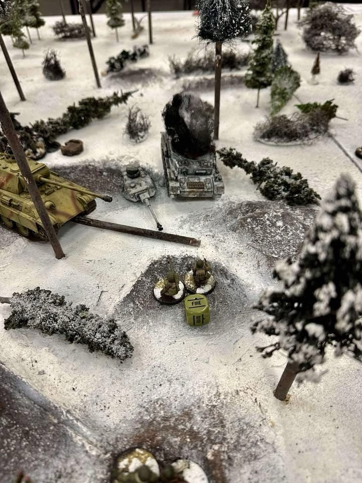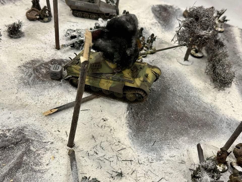 A few brave 101st bazookas faced off against the thick armor of the Tiger II and the Panther. Hitting never seemed to be the issue… its always the Pen roll! The Americans showed an amazing amount of fire discipline, staying hidden as the Germans were well within 18”. The Tank Destroyers raced on and had a few duels with the panzers before ultimately being destroyed by one and swarmed with infantry on another, but not before the King Tiger was made a burning wreck. It had just rumbled over the first defensive berm as infantry nervously ducked for cover in front of it.