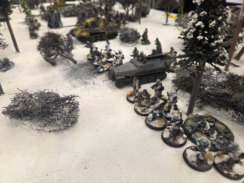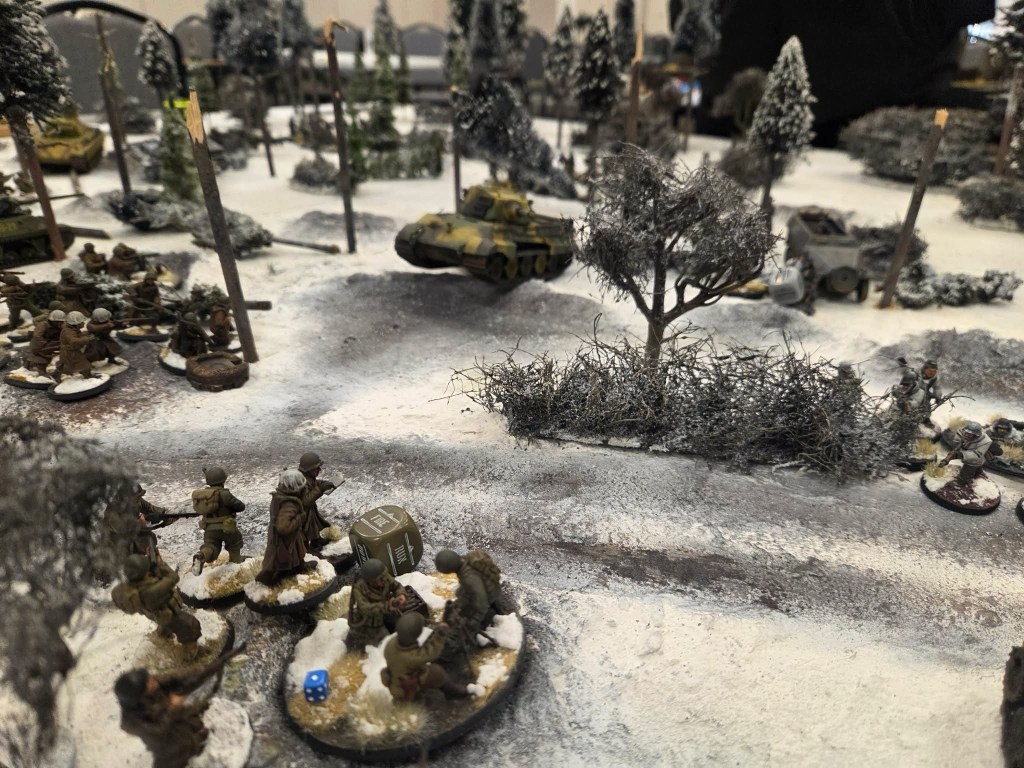 The board would have an 18″ line of sight due to fog and the forest. That would mean much of the engagement would be taking place at very close range. Vehicles could only move at an “Advance” order in the forest due to having to pick their way through the trees. Infantry could move as normal. However a “Run” move would automatically give a pin marker to represent exhaustion for running in the snow. Due to the whole board being woods all units would get a soft cover save regardless of where they were on the board to abstract the cover provided by drifts, trees, etc.. Foxholes would of course give a hard cover save.